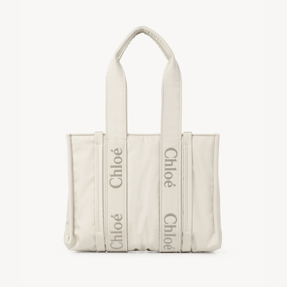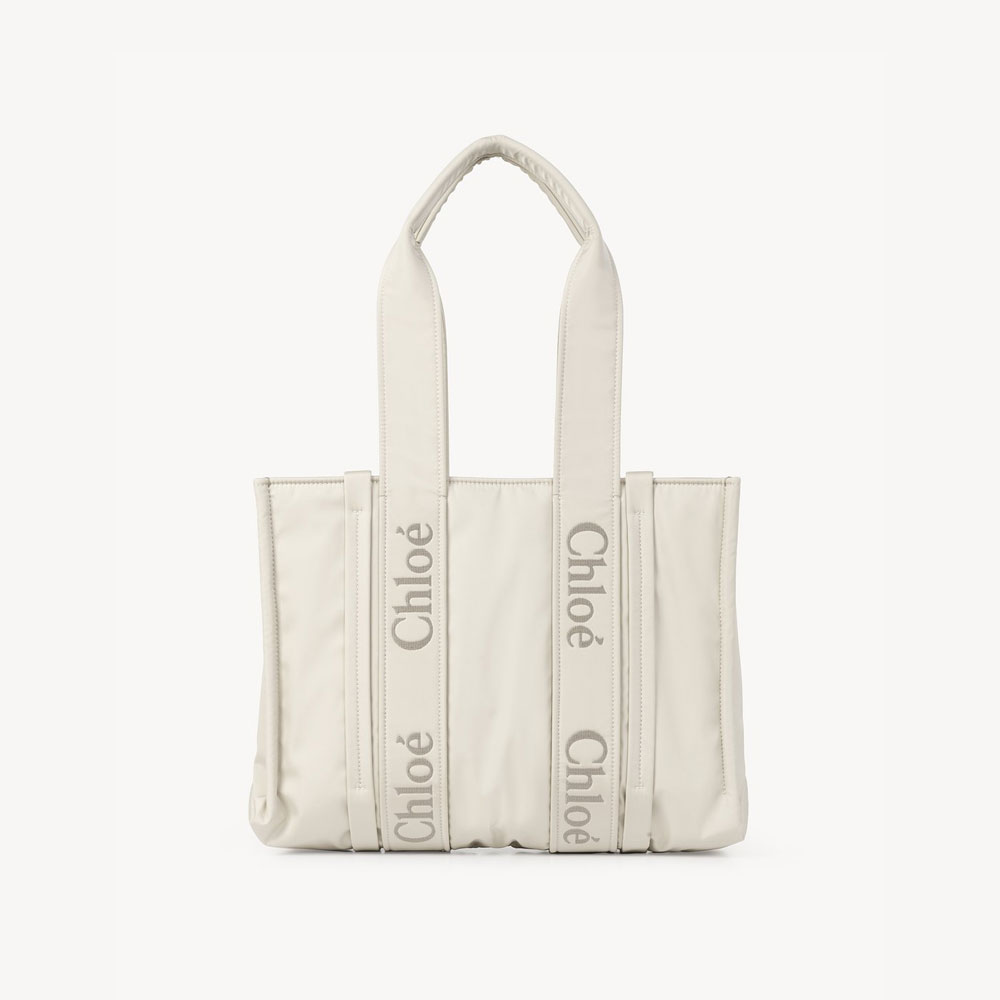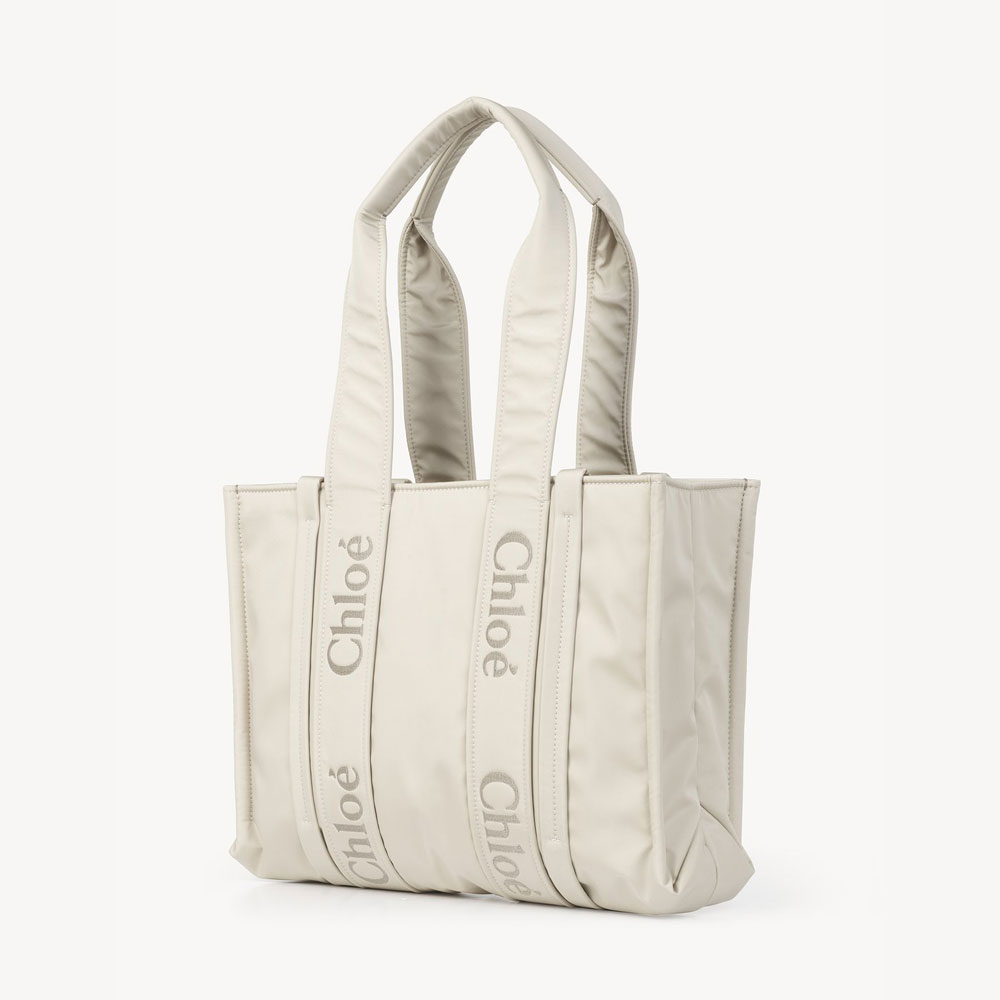 Crafted from recycled nylon, this medium Woody tote bag is a spacious bag with a roomy inside compartment and a practical flat pocket.The bag's sharp, modern lines are emphasized by vertical strips, while the Chloe logo embroidery lends a signature touch. Carry this tote bag comfortably on the shoulder.All about Woody...The Woody line is characterized by the signature Chloe logo carried over from the Maison's iconic mules. It showcases a modern, minimalist silhouette ranging from nano to large sizes.