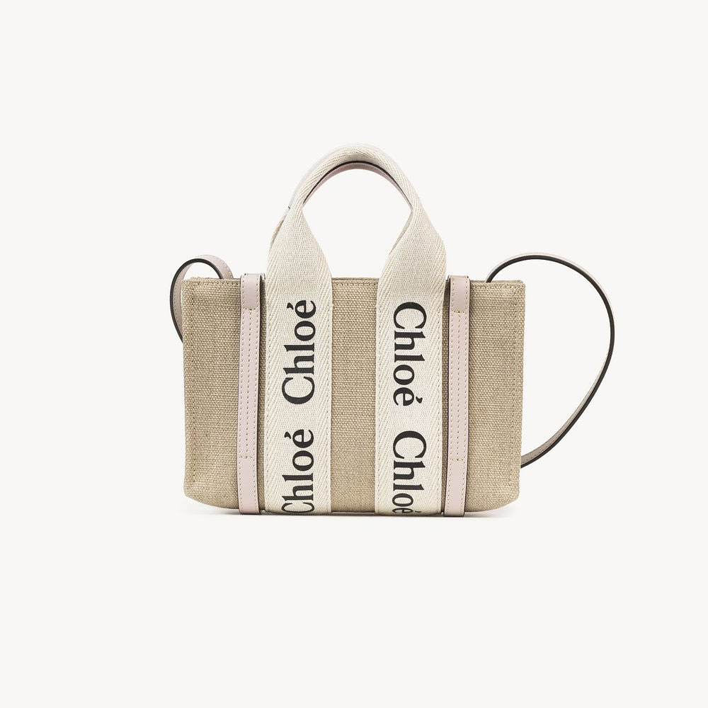 Crafted from linen canvas detailed with shiny calfskin strips, this mini Woody tote bag is a compact accessory with a strong summer attitude. The main compartment fits a mobile phone.The bag's sharp, modern lines are emphasized by the contrasting vertical leather strips and the signature Chloe logo. Carry this mini bag in hand or cross-body with the long strap.All about Woody...The Woody line is characterized by the signature Chloe logo carried over from the Maison's iconic mules. It showcases a modern, minimalist silhouette ranging from nano to large sizes.
