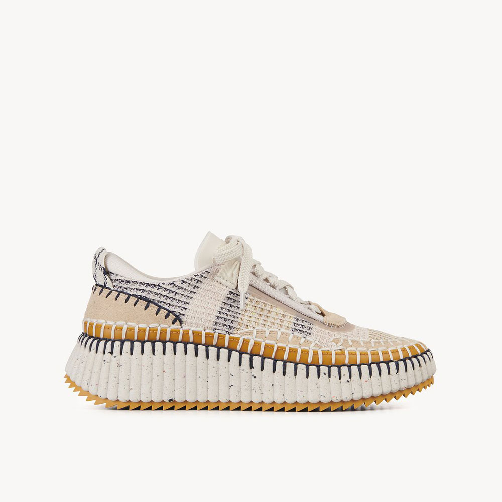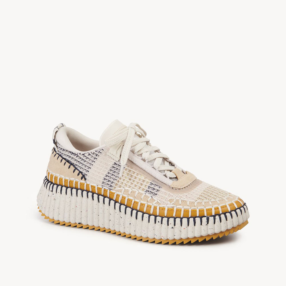 Rooted in the Maison's commitment to sustainability, the eco-designed Nama sneaker is crafted from a rich mix of materials with 40% of its weight made up of recycled debris.The bold, lightweight structure features a hand-stitched mesh upper, showcasing authentic Chloe craftsmanship. Set on a contrasting, ridged sole, this unisex sneaker is ultra-comfortable with a cool, sporty aesthetic. The Chloe logo at the back adds a signature touch.