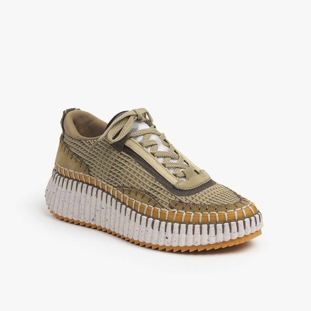 Rooted in the Maison's commitment to sustainability, the eco-designed Nama sneaker is crafted from a rich mix of materials with 40% of its weight made up of recycled debris.The bold, lightweight structure features a hand-stitched mesh upper, showcasing authentic Chloe craftsmanship. Set on a contrasting, ridged sole, this sneaker for women is ultra-comfortable with a cool, sporty aesthetic. The Chloe logo at the back adds a signature touch.