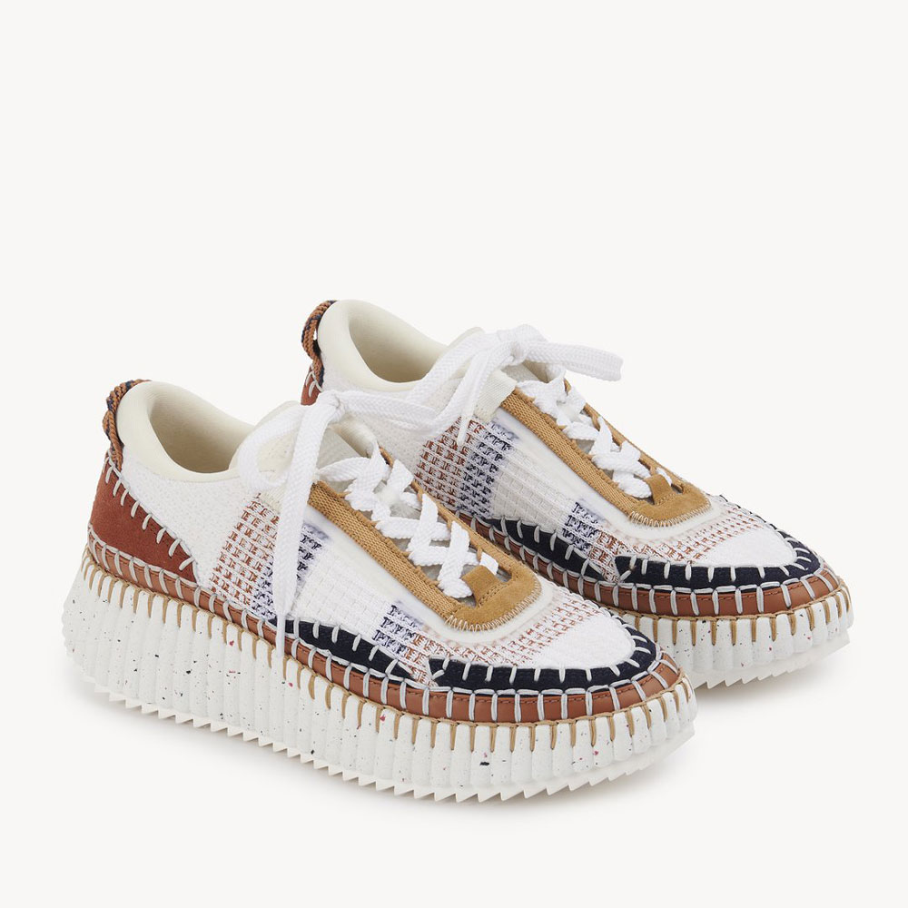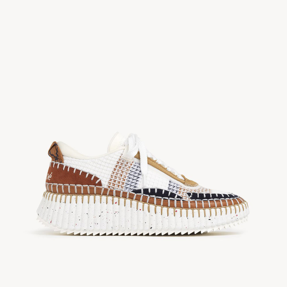 Rooted in the Maison's commitment to sustainability, the eco-designed Nama sneaker is crafted from a rich mix of materials with 40% of its weight made up of recycled debris.The bold, lightweight structure features a hand-stitched mesh upper, showcasing authentic Chloe craftsmanship. Set on a contrasting, ridged sole, this women's sneaker is ultra-comfortable with a cool, sporty aesthetic. The Chloe logo at the back adds a signature touch.
