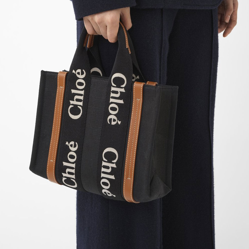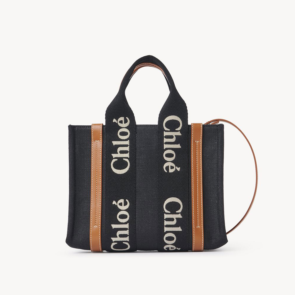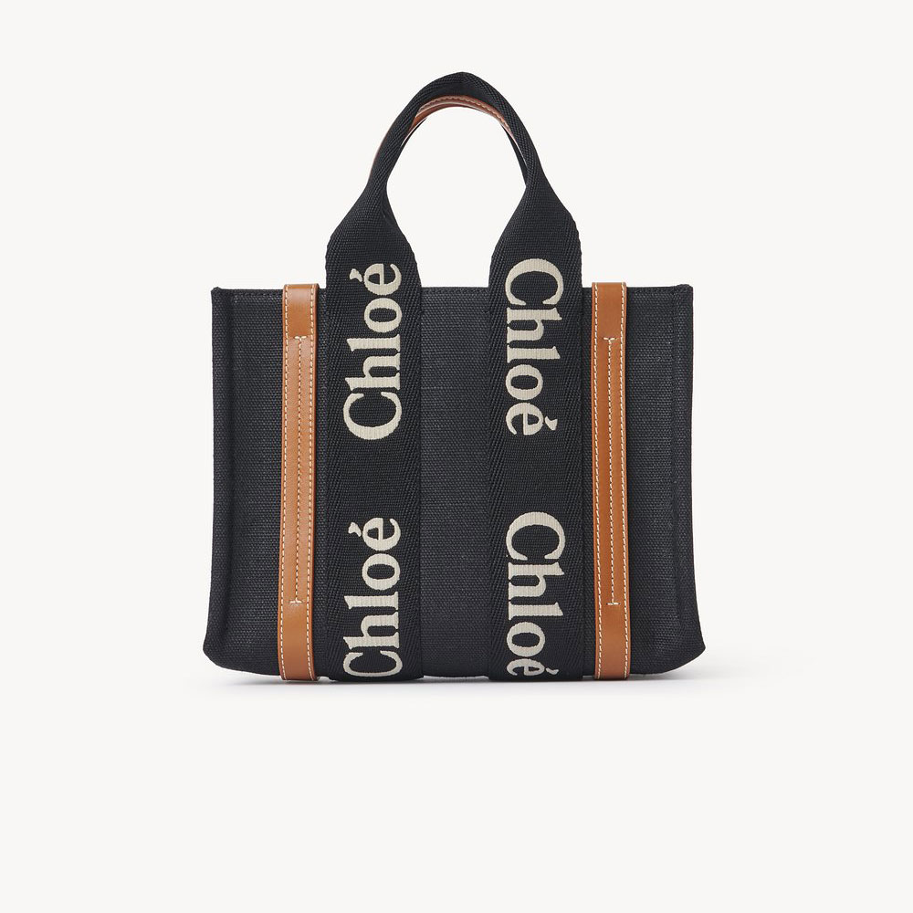 Showcasing a textural interplay of linen canvas and shiny calfskin, this small Woody tote bag is a soft day-to-evening bag with a long, removable strap in addition to the top handles. The roomy inside compartment includes a practical flat pocket in leather for an elevated touch. Linen lining matches a refined finish with a lower environmental impact.Carry this versatile small bag on the arm, shoulder or cross-body.All about Woody...The Woody line is characterized by the signature Chloe logo carried over from the Maison's iconic mules. It showcases a modern, minimalist silhouette ranging from nano to large sizes.