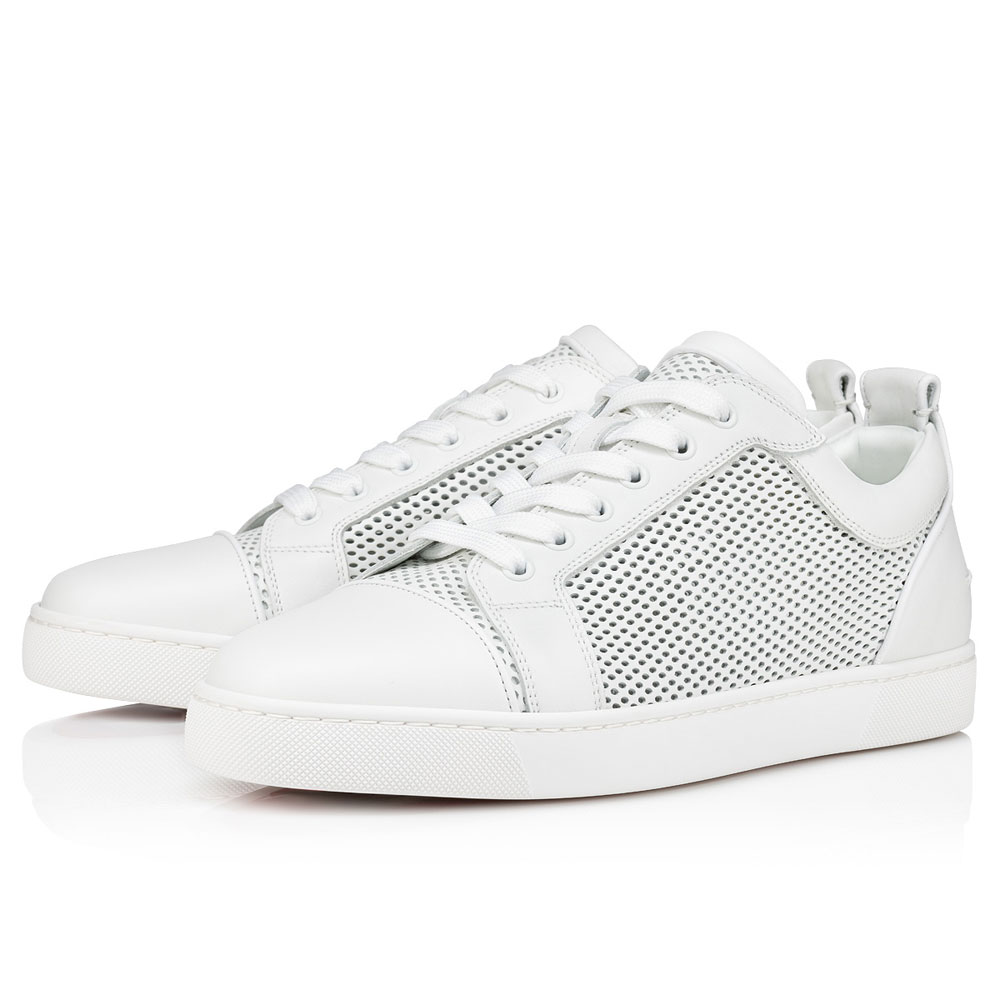 A timeless style evoking the codes of a 1980s tennis shoe. the Louis Junior sneaker makes its appearance season after season crafted in a variety of textures and fabrics. This summery Maison Christian Louboutin model in all-over white features smooth calf leather combined with calf perfore leather mesh. a striking design revealing the foot beneath. It is finished with meticulous topstitching.