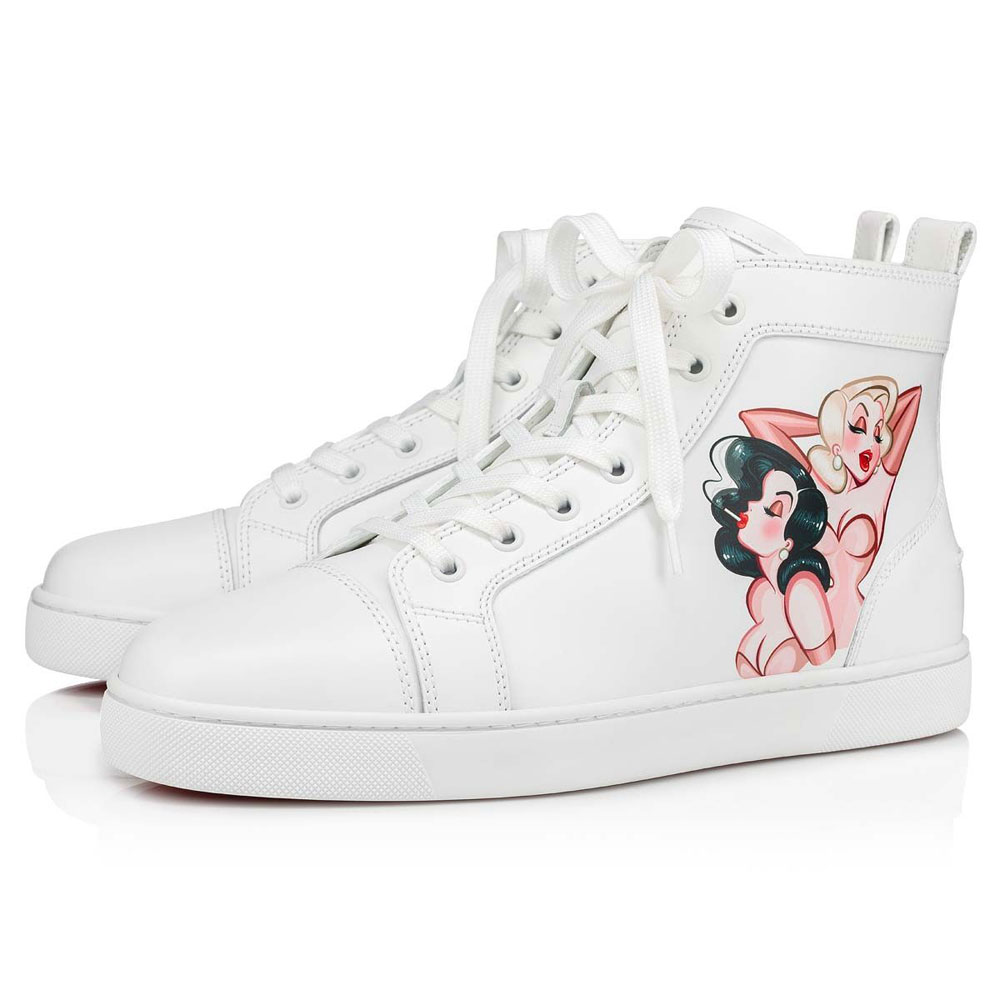 The Loupin Up high-top sneaker is an iconic model by Maison Christian Louboutin and features a white rubber sole. The slender vamp. With sleek lines. Is entirely crafted in white calfskin leather featuring a capsule motif representing retro pin-ups as an ode to the femininity which is so dear to the designer. This shoe is enhanced by delicate finishes and discreet topstitching and offers timeless elegance.