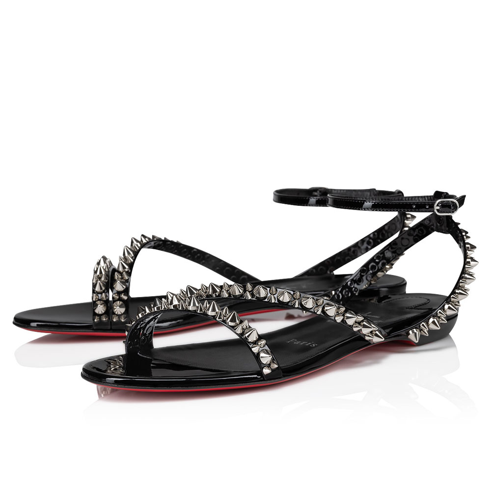 The Malfadina Spikes reworks the codes of the elegant Malfadina pump with a signature cross-over strap at the front. This model features an almond-shaped toe and TPU sole with a small internal mini heel. A single strap rises up the back of the heel. joining at the top with the ankle strap. A daring style crafted in black patent leather with Maison Christian Louboutin signature silver spikes.