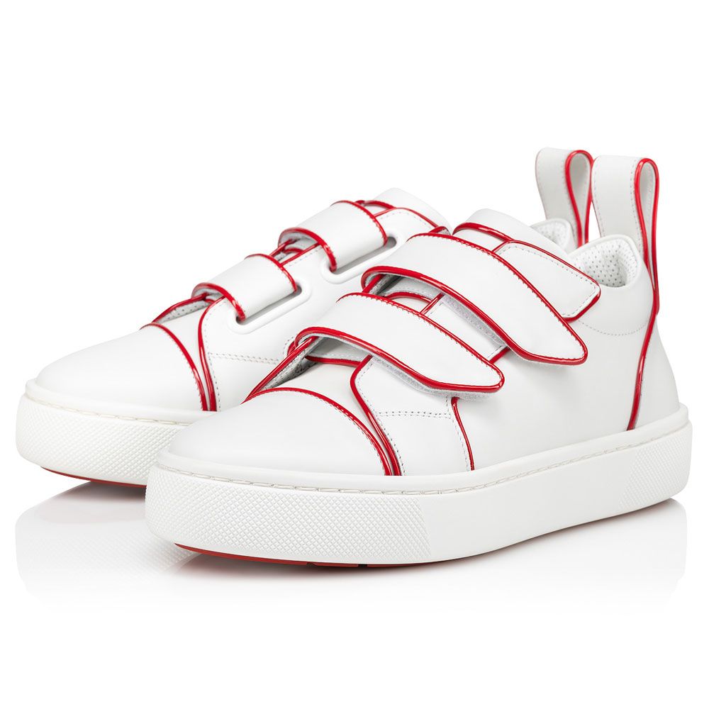 Inspired by a children's model. The Maxi Toyototoy sneaker has a playful style. This timeless Maison Christian Louboutin model has a white rubber sole and is crafted in white calf leather with contrasting signature red edging. It is easy to slip on and off. As it has a hook and loop fastening. And a two-color heel tab at the back. With the Maxi Me collection. Parents and their kids can wear matching sneakers.