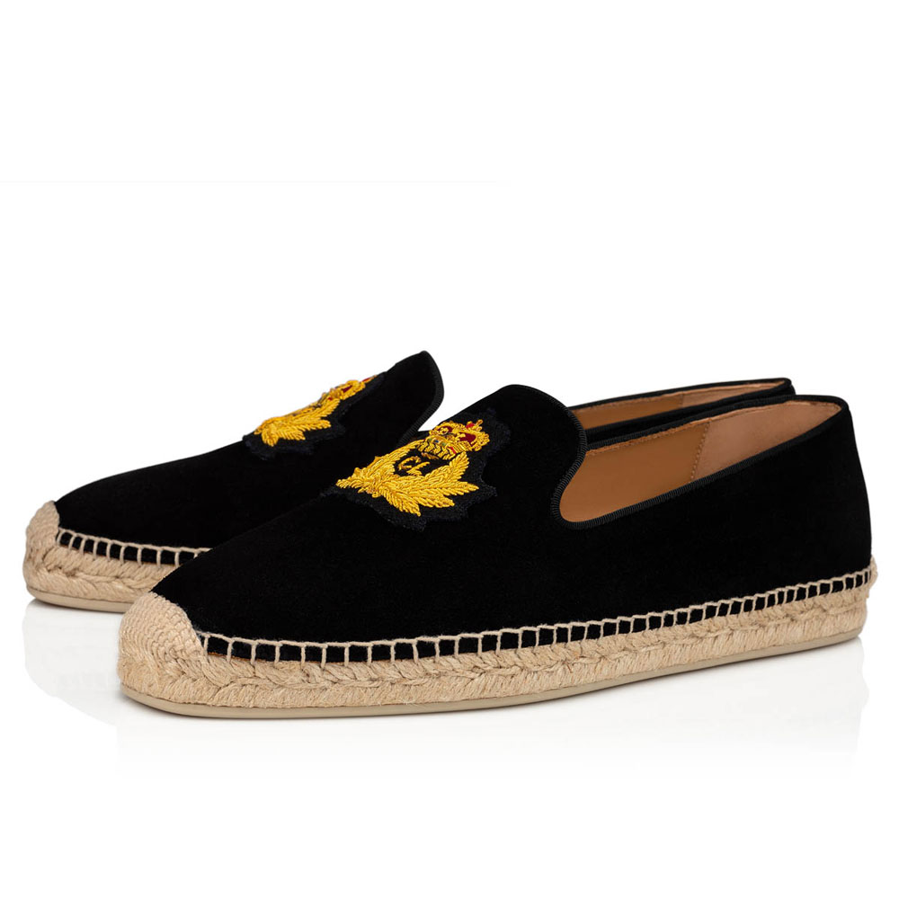 The Nanou is a contemporary reworking of the traditional espadrille. This iconic summer shoe features a classic stitched construction with a lightweight rubber sole. inspired by the Maisons sneakers. for enhanced comfort. Crafted from all-over black waxed fabric with a signature grosgrain trim. The rope around the sole adds a nautical touch. while the CL logo crest on the front evokes cannetille embroidery.