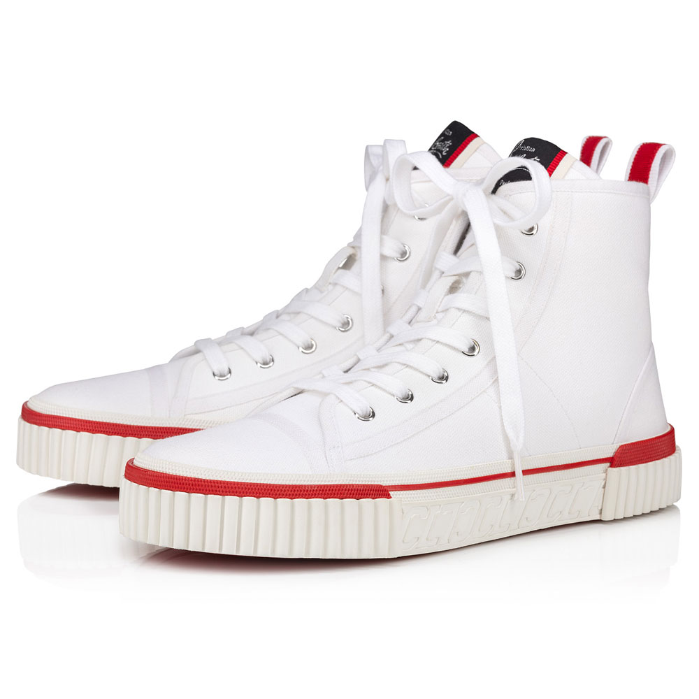 The timeless Pedro high-top sneaker is an enchanting summer style. This model has a two-color heel tab and is crafted in white cotton. The white textured rubber sole is enhanced with signature red edging and embossed with a CL monogram The Maison Christian Louboutin logo appears on a contrasting label on the tongue.