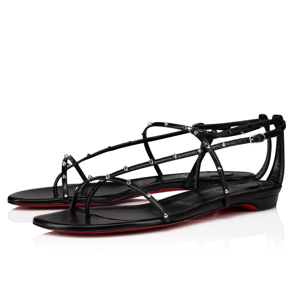 New this season. the Riojana Spikes are inspired by a former collection's iconic Gwynitta. This post sandal features two delicate spike-embellished straps in black kid leather: one main crossover strap that encases the foot and ankle. ending with a thong detail. and a front strap. A wide sandal last with an almond toe box and linen liner offer a very wearable flat sandal that channels edgy urban attitude.