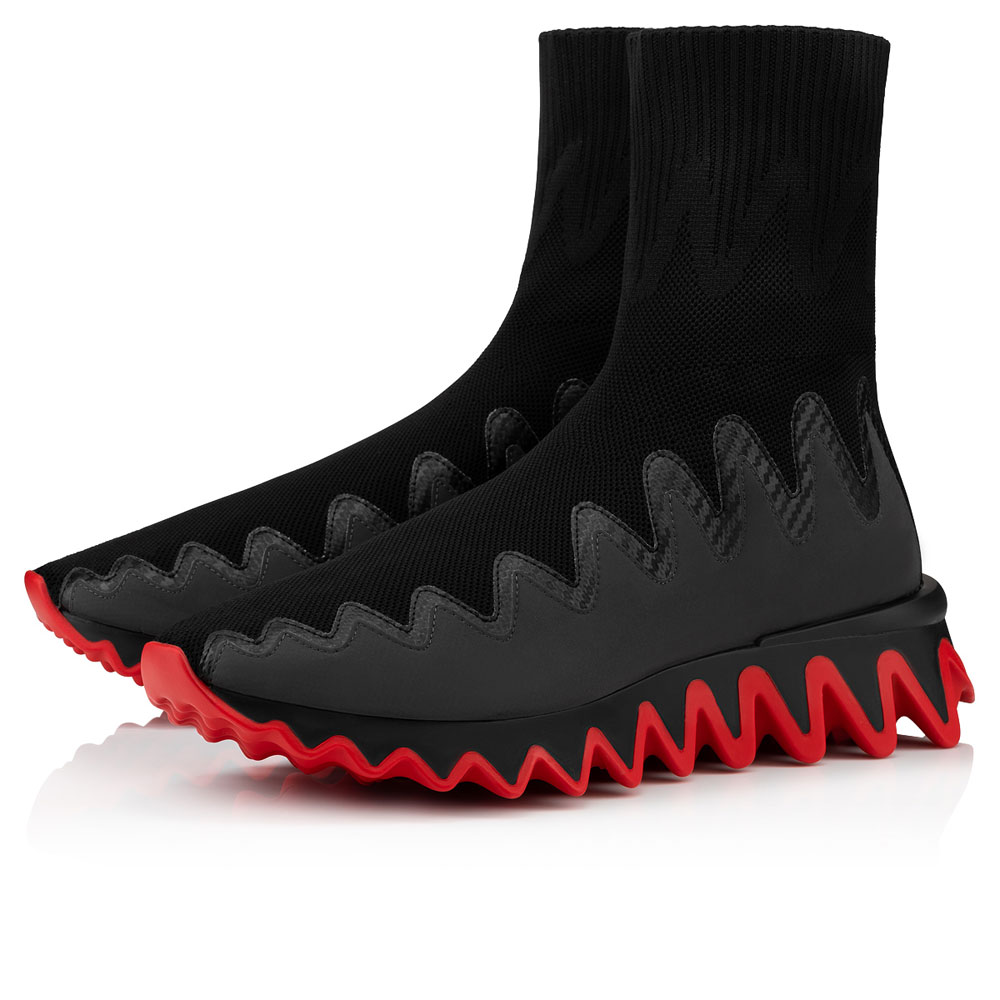 Showcasing Maison Christian Louboutin's creativity. the Sharky Sock men's sneaker has a red and black rubber sole evoking shark teeth. Rising up the ankle like a sock. it is crafted entirely in black mesh. This sporty model features contrasting serrated edge patterns. elegantly dressing the foot.