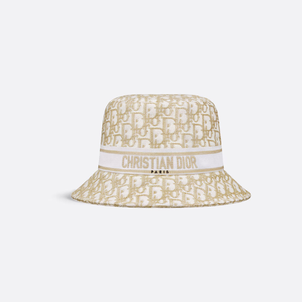 The D-Bobby bucket hat is available this season in an elegant and sophisticated version. Crafted in cotton fully embroidered with the white and gold-tone Dior Oblique motif, it is enhanced by a tonal band embroidered with the Christian Dior Paris signature. Modern and refined, the small brim hat will lend the finishing touch to daytime attire and can be coordinated with other Dior Oblique pieces from the collection.