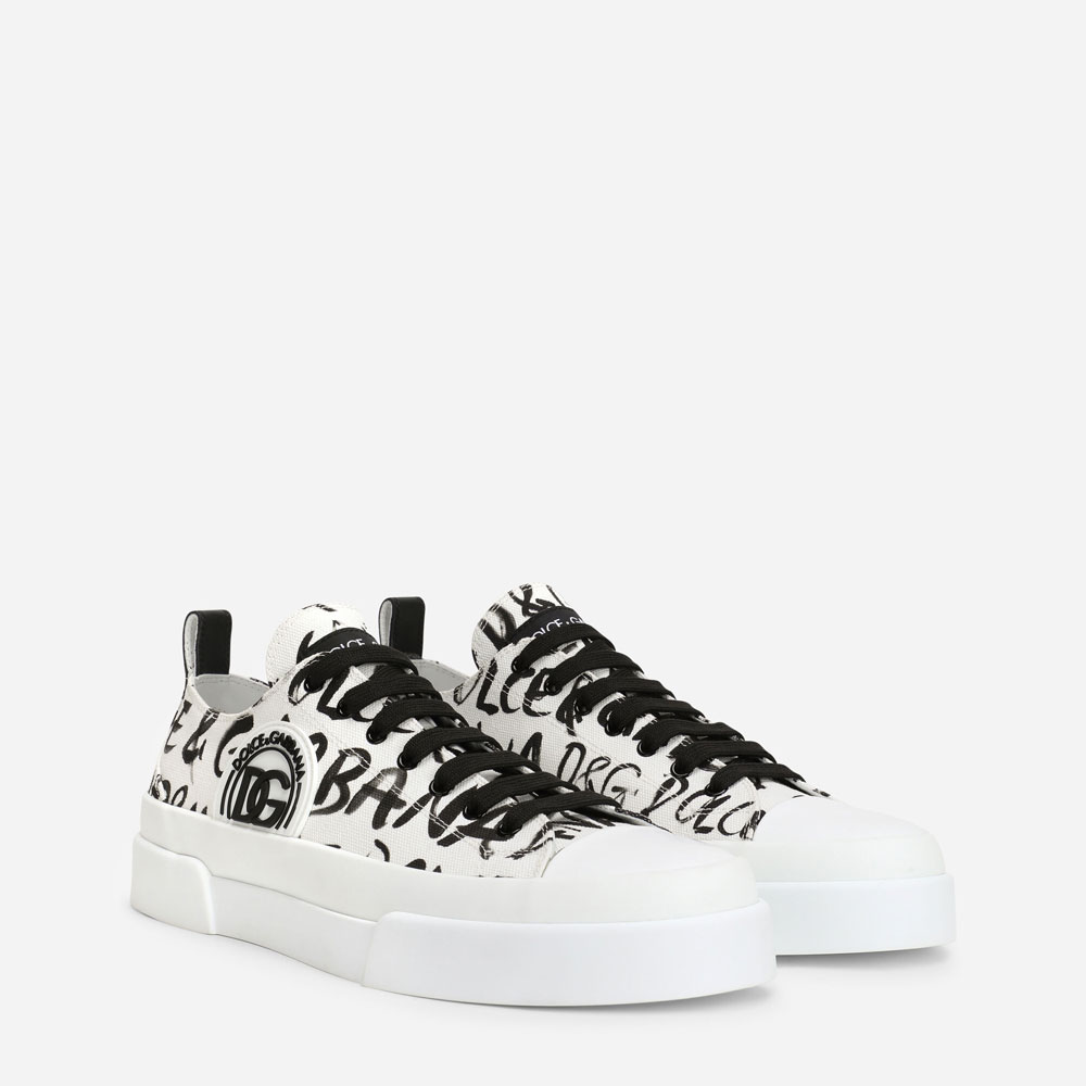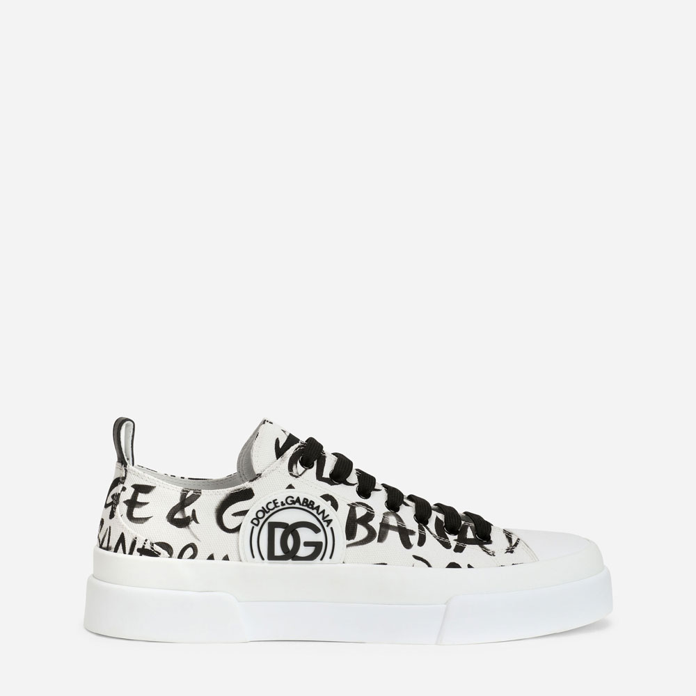The iconic elements and signature details of the fashion house have been reworked with a contemporary edge. Flaunting bold. Urban style. These new canvas Portofino Light sneakers feature the new all-over logo print. Perfect for everyday use. They come with the new rubberized DG logo.