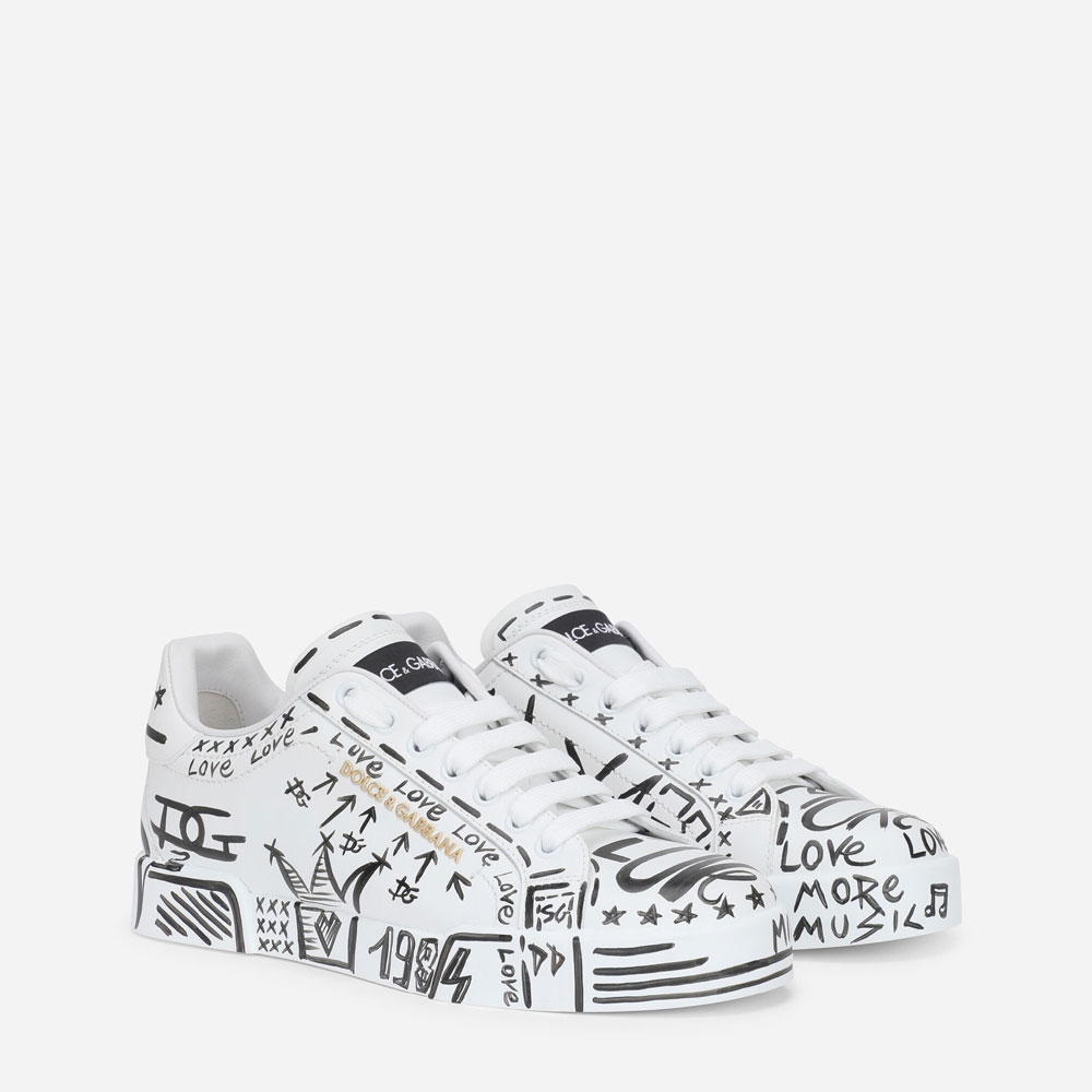 The forerunner of all Dolce&Gabbana sneakers. The Portofino sneakers are presenting a new version. They feature hand-painted lettering and Dolce&Gabbana lettering in light gold-plated metal.