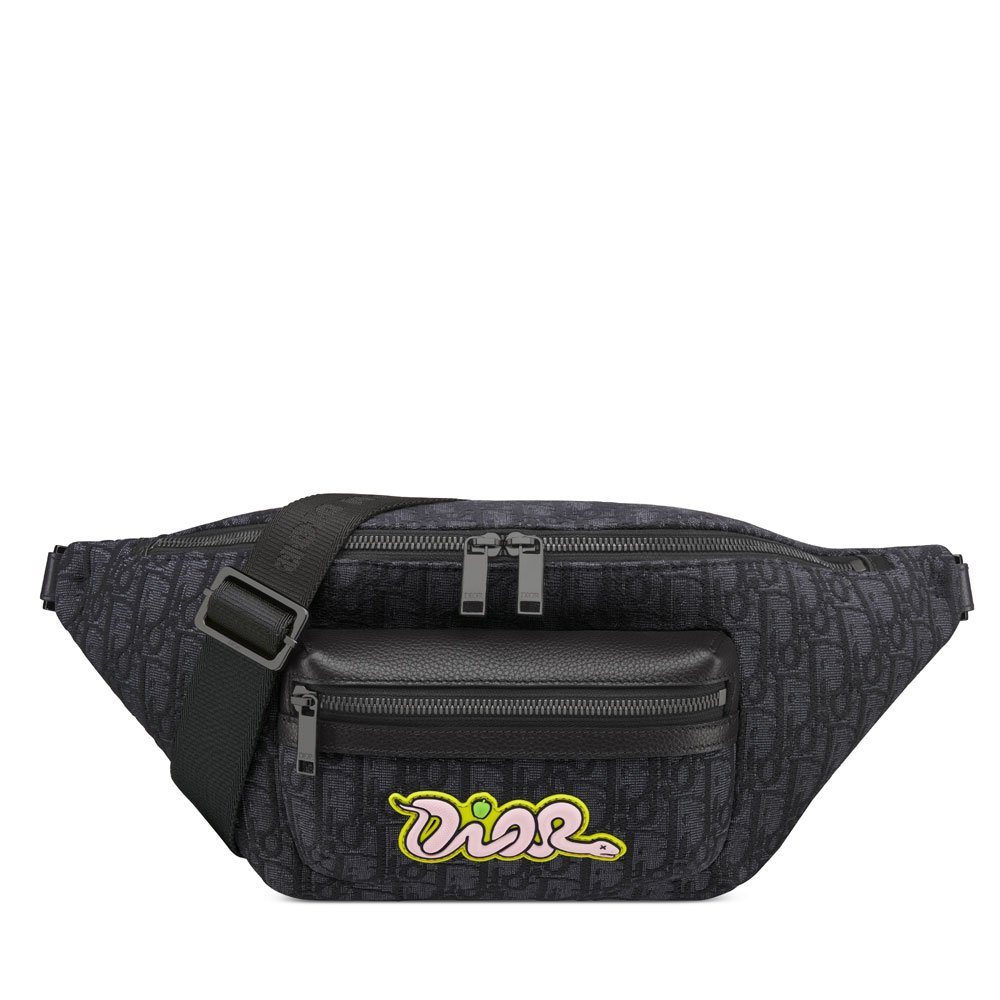 The Rider 2.0 belt bag belongs to the limited-edition DIOR AND KAWS collaboration collection. Designed in black Dior Oblique jacquard fabric, its front showcases a zippered compartment finished with textured calfskin. A bold rubber emblem in contrasting pink and yellow highlights the partnership's signature snake motif The structured design includes a roomy main compartment for daily essentials and an adjustable leather strap for crossbody wear. Constructed with premium materials including technical fabric and supple calfskin, this piece balances functionality and style Key details include a dual-zip closure system, an exterior zip pocket for quick access, and the iconic DIOR AND KAWS graphic accent. Finished with embossed branding elements and reinforced stitching for durability.