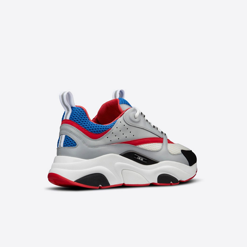 The B22 reinvents the "chunky" sneaker through a retro lens. Combining different materials and textures, including gray and red calfskin, black technical fabric and white and blue technical mesh, it has a bold, athletic-inspired aesthetic. Round laces and a raised DIOR signature on the side complement the thick black, white and red sculpted rubber sole. Worn with a casual look, the sneaker completes a sporty and contemporary silhouette.