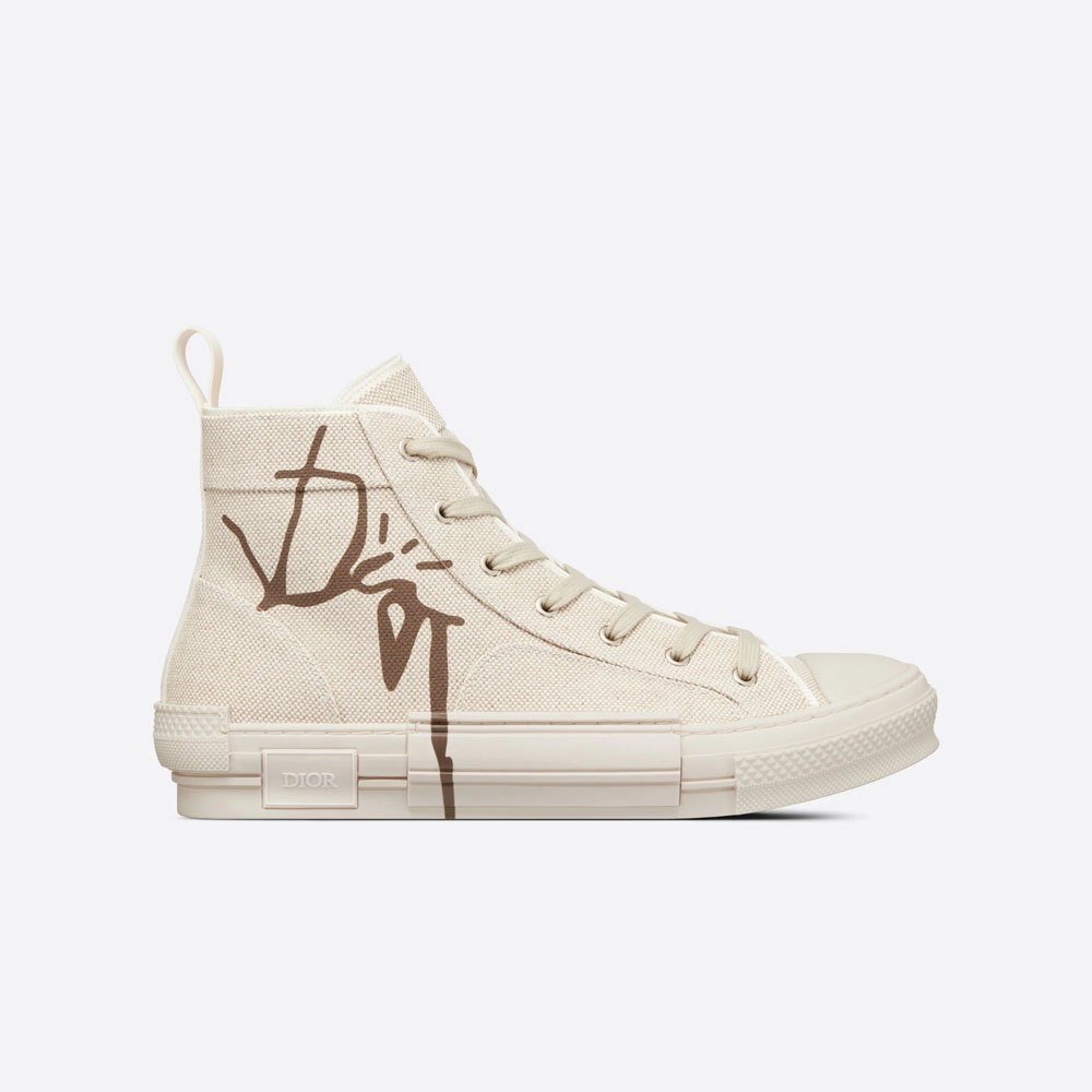 The B23 high-top sneaker is part of the exclusive collaboration with CACTUS JACK. Crafted in cream cotton canvas. it is enhanced by a coffee CACTUS JACK DIOR signature. The design maintains timeless sneaker codes. including laces and eyelets on the front. a rubber sole. a rounded. reworked and reinforced toe and a rear tab. It is enhanced with tonal details on the sides as well as a 'DIOR' signature. The sneaker will pair easily with any casual outfit and can be worn with other CACTUS JACK DIOR creations.