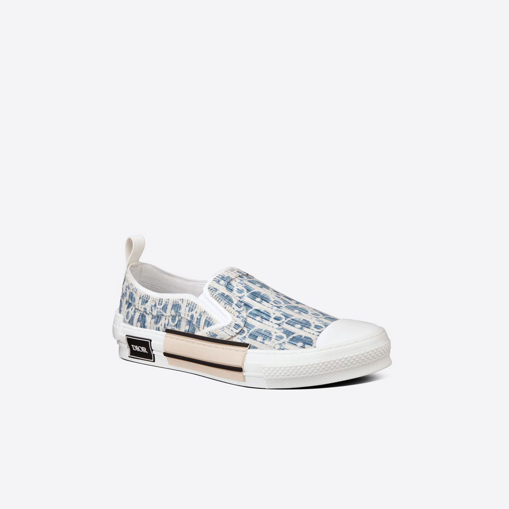 The B23 slip-on sneaker honors the hallmark Dior Oblique motif in a variation inspired by Japanese ancestral weaving techniques. The sneakers timeless codes, like the layering of translucent inserts, the front stretch bands, the white rubber sole with a DIOR signature on the sides, the rounded and reinforced toe and the rear tab are enhanced by contrasting side details. The slip-on style may be paired with other Dior Oblique Kasuri creations for a total look.