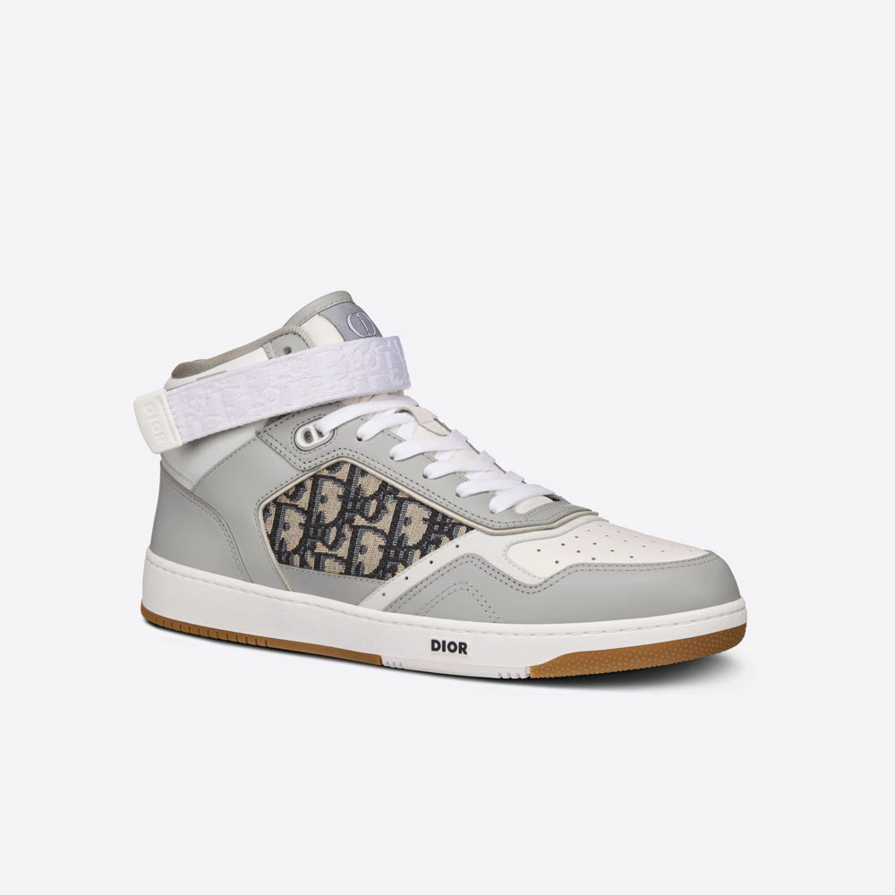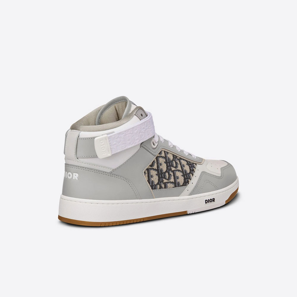 Although brand new for this collection, the B27 high-top sneaker is already a House essential. Crafted in gray and white smooth calfskin, the style is adorned with beige and black Dior Oblique jacquard inserts on the sides. The sneaker is enhanced with CD Icon eyelets as well as numerous emblematic details on the two-tone rubber sole, tab and back. An adjustable Dior Oblique strap completes the design. The high-top sneaker will enhance any favorite look.