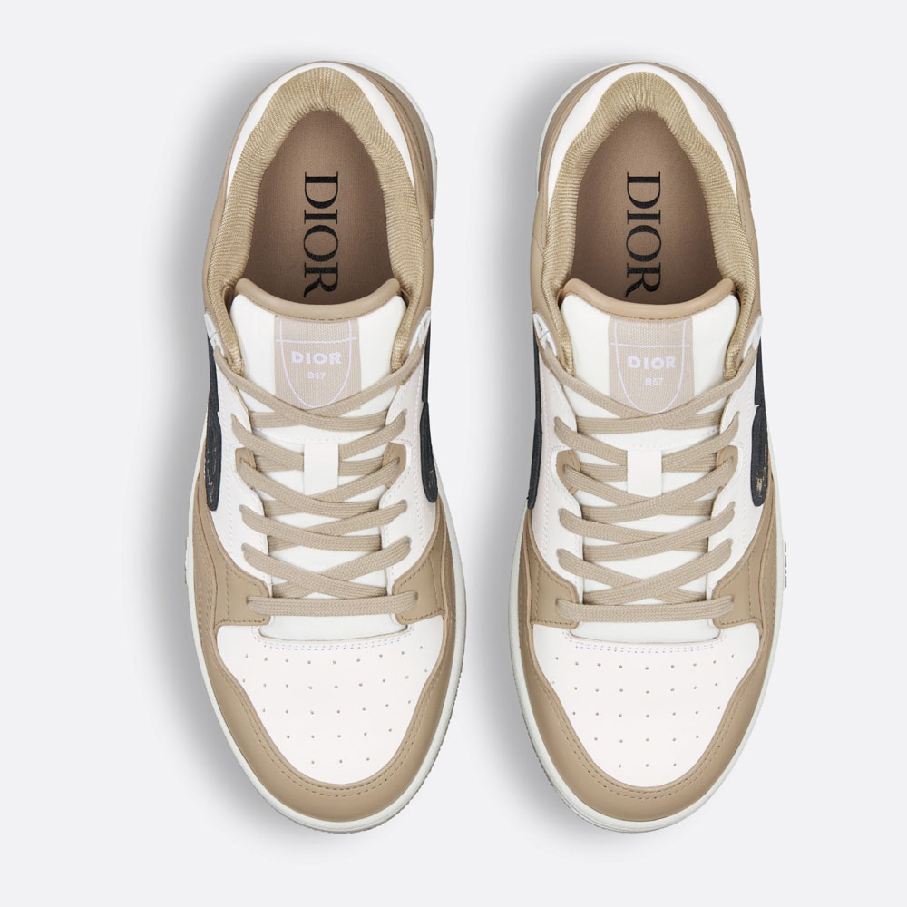 Debuting for Fall 2024, the B57 low-top sneaker is a new House essential. Crafted in beige and white smooth calfskin, the style is adorned with a beige and black Dior Oblique jacquard CD signature on the sides. The sneaker is enhanced by various hallmark details on the tongue, sole and rear, while perforated detailing, topstitching and a rubber insert accentuate its athletic appeal. Completed by a two-tone rubber sole, the sneaker will elevate any favorite outfit.