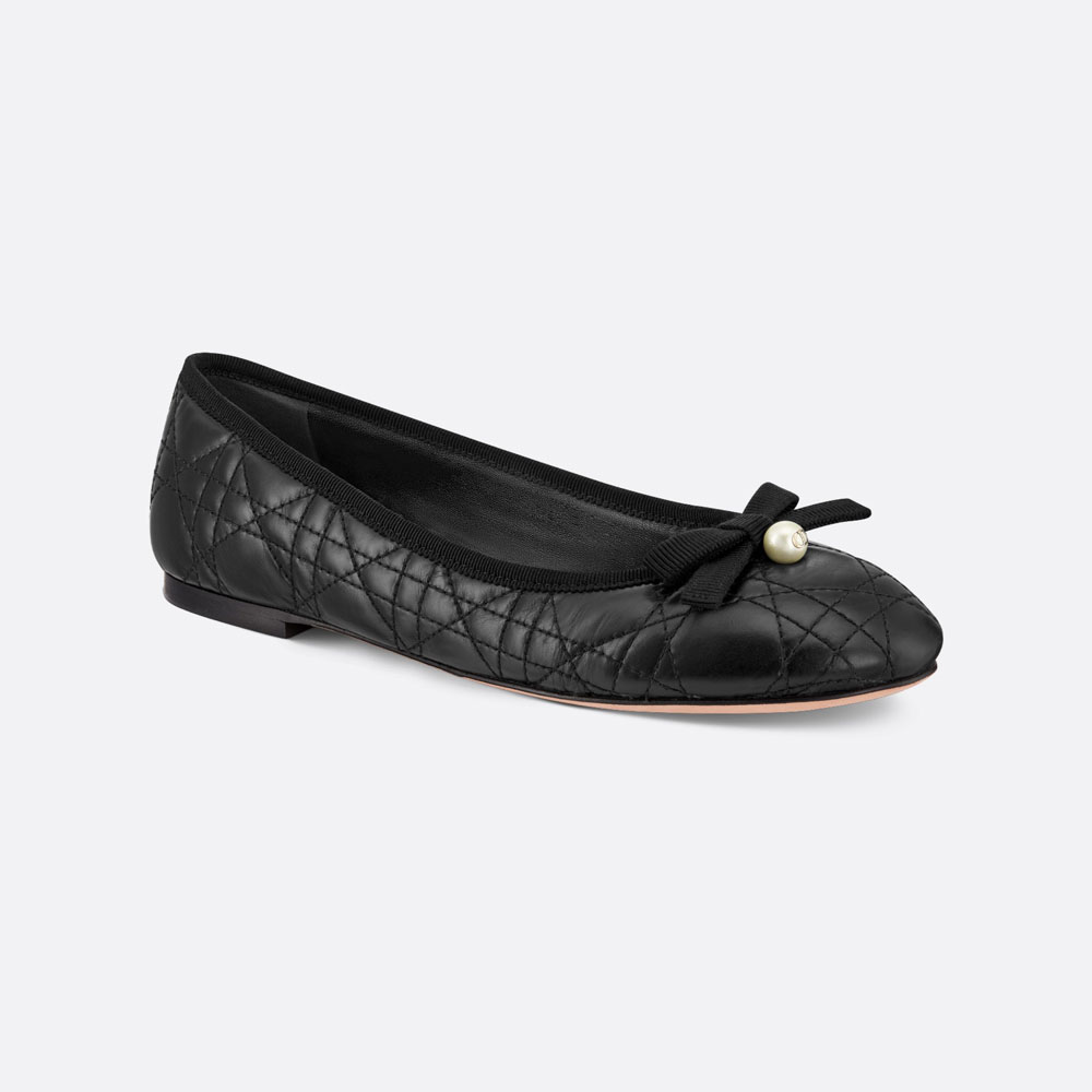 The Dior Ballet flat revisits a timeless pattern with elements of House couture. Crafted in black quilted calfskin with the Cannage motif, it is distinguished by a delicate grosgrain bow on the front adorned with a white CD resin pearl inspired by the iconic Dior Tribales earrings. Featuring a padded leather insole, the supple, comfortable ballet flat will add the finishing touch to all of the season's looks.