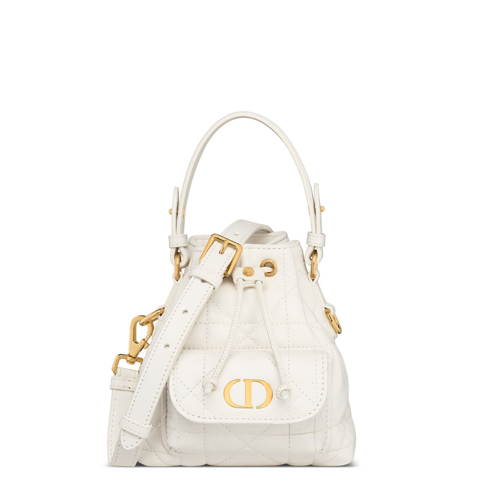 Introducing the elegant Dior Caro nano bucket bag, a chic accessory for Fall 2025. This stylish piece showcases luxurious latte lambskin with distinctive Macrocannage stitching. The design includes a convenient front flap pocket with signature CD hardware in antique gold. Its versatile carrying options feature detachable handles and an adjustable strap. Key details: - Signature CD emblem - Secure drawstring closure - Spacious main compartment - Comes with protective dust bag Size:14 x 15 x 7CM