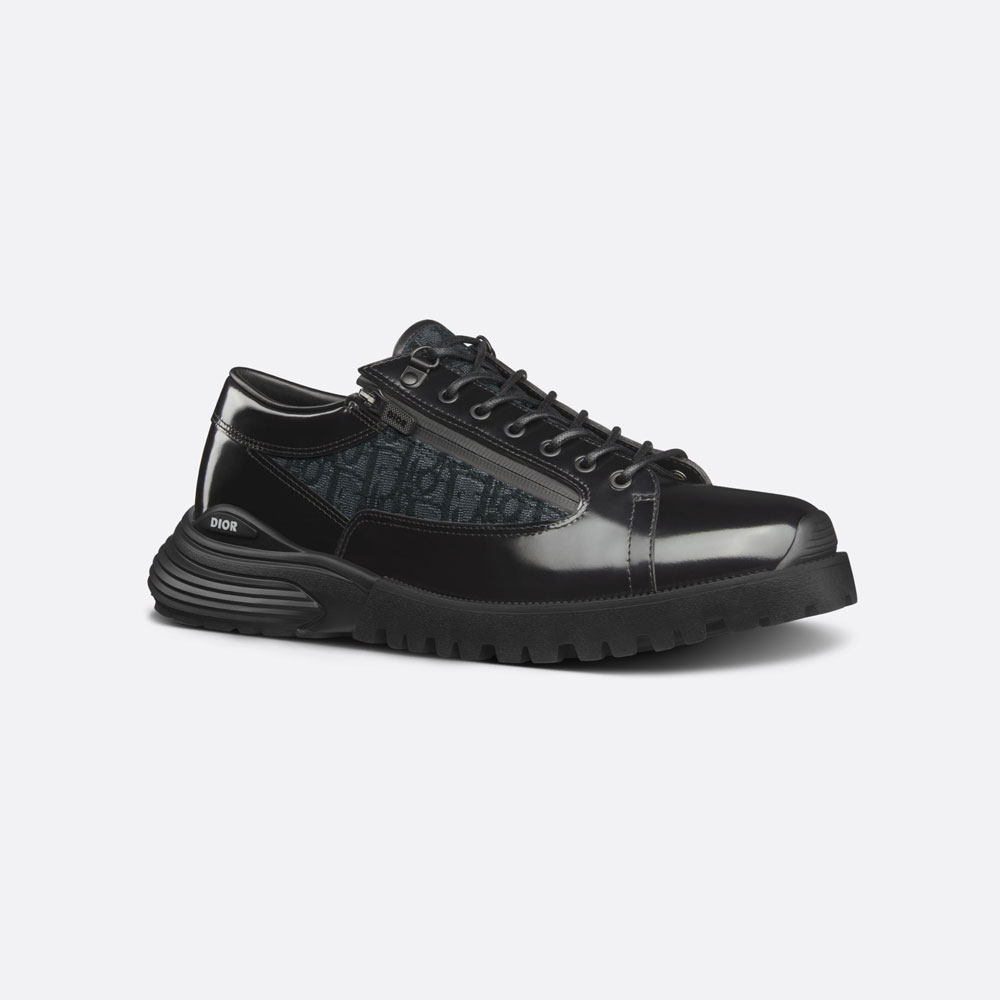 the Dior Combat Derby shoe presents a hybrid, modern and athletic silhouette. The black polished calfskin style is embellished with Dior Oblique jacquard inserts on the sides and on the tongue. The shoe features laces and a technical zip closure, while the lightweight hybrid sole accentuates its couture appeal. Enhanced by the Dior signature on the side, the shoe will add a contemporary touch to all of the season's looks.