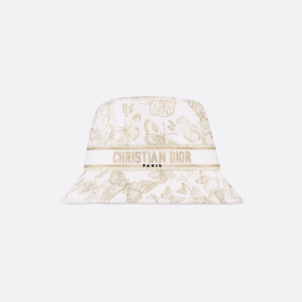 The D-Bobby bucket hat features the Toile de Jouy Mexico motif by Pietro Ruffo, showcasing butterflies and traditional Mexican flowers in a concert of colors. Crafted in white and gold-tone fully embroidered cotton, the style is enhanced by a tonal band embroidered with the Christian Dior Paris signature. Sophisticated and refined, the small brim bucket hat will lend the finishing touch to daytime outfits and can be coordinated with other Toile de Jouy Mexico creations from the collection.