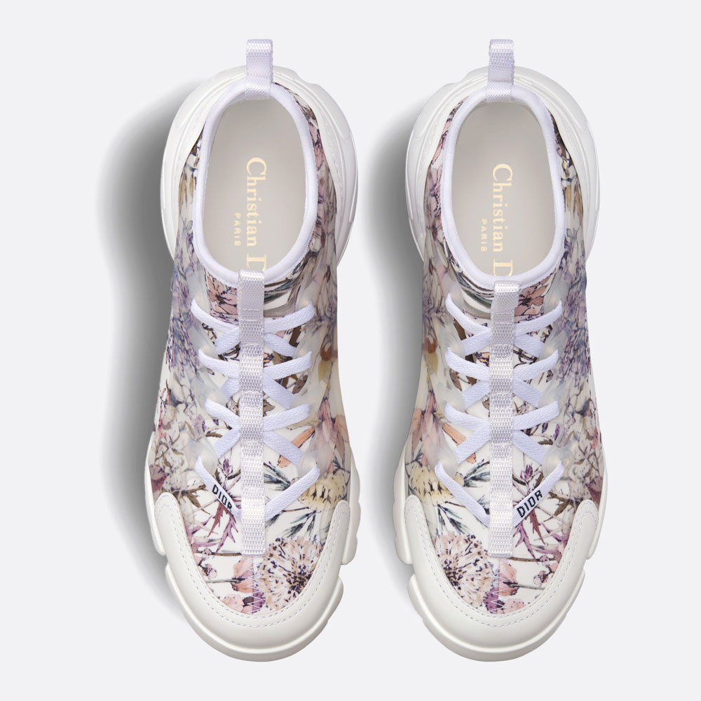The D-Connect sneaker presents the white multicolor Dior 4 Saisons Hiver motif by Pietro Ruffo, showcasing wintry flowers and plants in a bucolic design. The technical fabric style features a thick sole, rubber detailing and a rounded toe with white leather inserts. The pairing of materials accented by the Dior signature lends contemporary appeal to the sneaker, which can be styled with other Dior 4 Saisons creations from the collection.