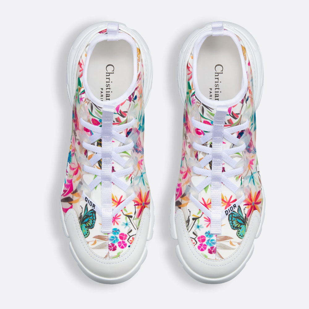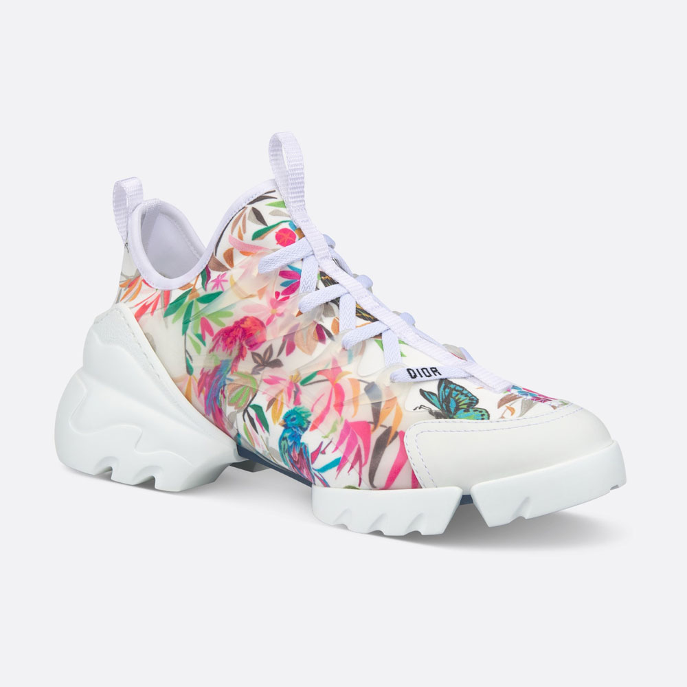The D-Connect sneaker features a white multicolor Toile de Jouy Fantastica motif, a modern interpretation of the iconic pattern that showcases a colorful jungle full of parrots, monkeys and butterflies in pop colors. The technical fabric style features a thick sole, rubber details and a round toe with white leather cutouts. The combination of materials punctuated with the Dior signature offers very contemporary appeal to the sneaker that will pair with other Toile de Jouy Fantastica creations from the collection.