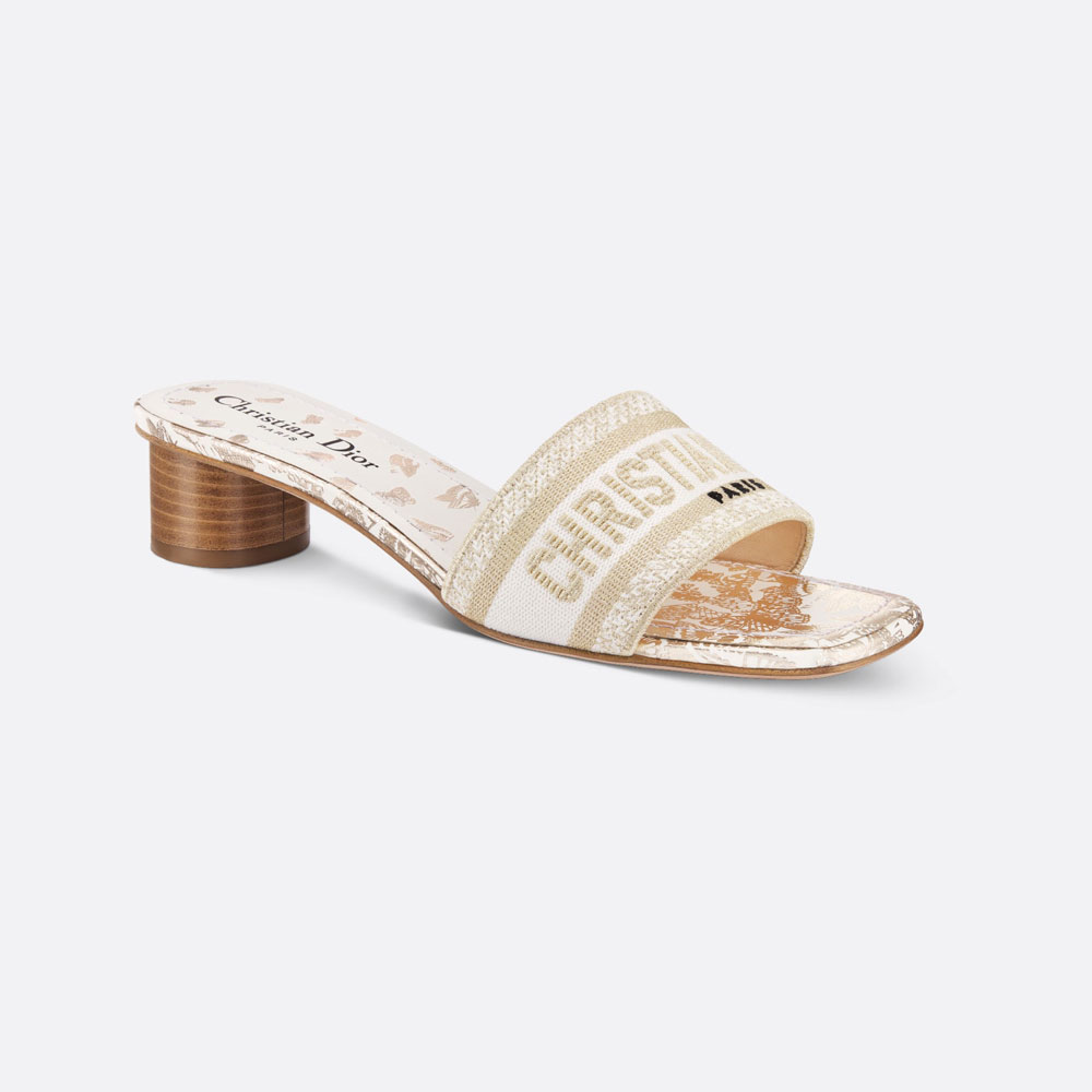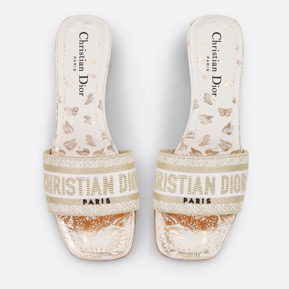 The hallmark Dway heeled slide features a white and gold-tone Gradient Butterflies motif, showcasing a flight of butterflies with a poetic gradient effect. The upper, punctuated with metallic thread, is embroidered with the Christian Dior Paris signature for an instantly recognizable touch, while the square toe accentuates its contemporary appeal. Completed by a 3.5 cm (1.5) cylindrical heel, the slide will add a modern touch to any outfit and will pair with other Gradient Butterflies creations from the collection.