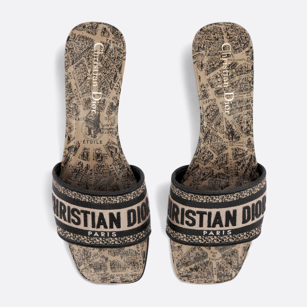 The Dway heeled slide showcases the Plan de Paris motif, inspired by House archives and centered around Dior's historic address on Avenue Montaigne. The beige and black cotton upper, embroidered with the Christian Dior Paris signature, makes it an immediate statement piece. Its streamlined design allows it to be easily slipped on to complete a relaxed outfit. Featuring a 3.5 cm (1.5) cylindrical heel, the slide lends a modern touch to any look and will pair with other Plan de Paris creations from the collection.