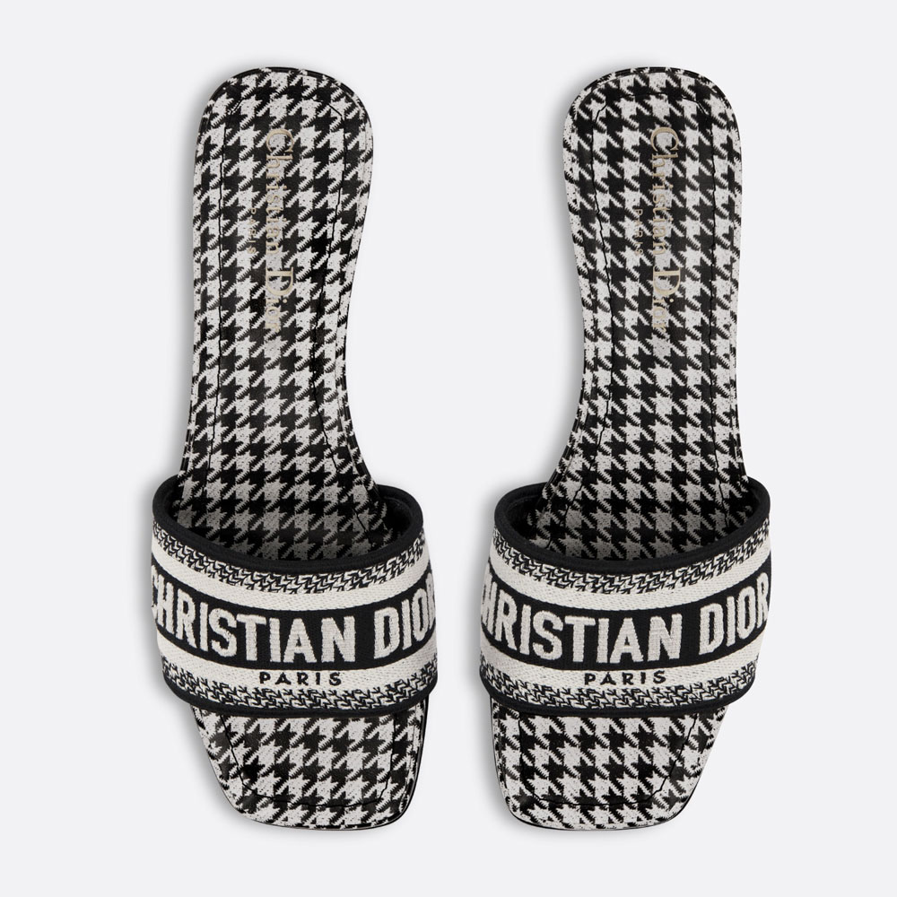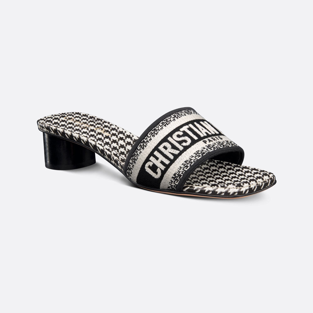 The Dway heeled slide features the micro-Houndstooth motif. The black and white cotton upper has an embroidered Christian Dior Paris signature for an instantly recognizable touch. Its streamlined silhouette makes it easy to slip on to complete a relaxed outfit. Completed by a 3.5 cm (1.5) cylindrical heel, the slide will add a modern touch to any attire and will pair with other Houndstooth creations from the collection.