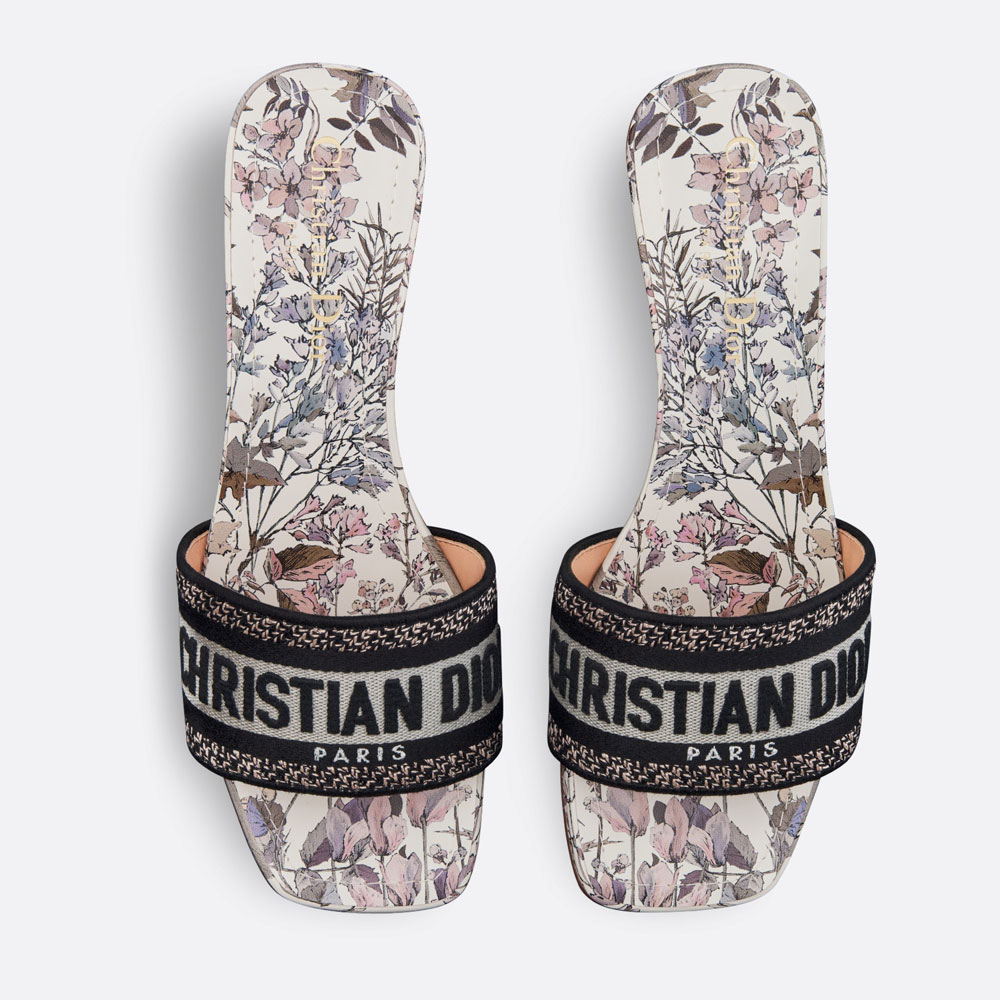 The hallmark Dway heeled slide features the white multicolor Dior 4 Saisons Hiver motif by Pietro Ruffo, showcasing wintry flowers and plants in a bucolic design. The cotton upper, embroidered with the Christian Dior Paris signature, lends an instantly recognizable touch, while the square toe adds modern appeal. Completed by a 3.5-cm (1.5) cylindrical heel, the slide will lend a contemporary touch to outfits and can be coordinated with other Dior 4 Saisons creations from the collection.