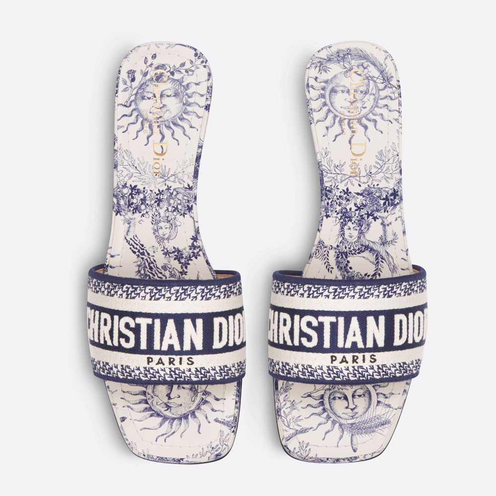 The hallmark Dway heeled slide offers a new take on the House icon with the white and blue Toile de Jouy Soleil motif, layering suns and crescent moons into a floral design representing the four seasons. The cotton upper, embroidered with the Christian Dior Paris signature, lends an instantly recognizable touch, while the square toe adds modern appeal. Completed by a 3.5-cm (1.5) cylindrical heel, the slide will lend a contemporary touch to outfits and can be coordinated with other Toile de Jouy Soleil creations from the collection.