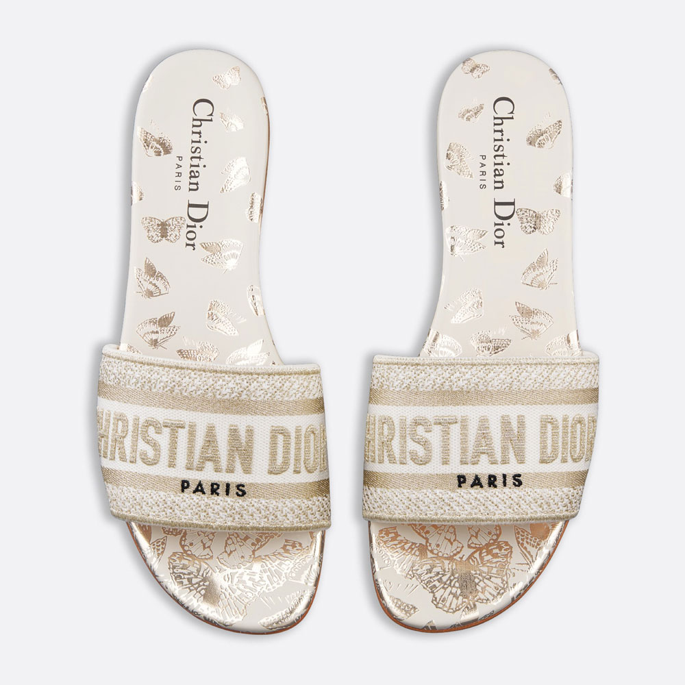 The Dway slide is a hallmark and timeless style featuring a white and gold-tone Gradient Butterflies motif, showcasing a flight of butterflies with a poetic gradient effect. The upper is punctuated with metallic thread and has an embroidered Christian Dior Paris signature that instantly stands out. Its streamlined silhouette makes it easy to slip on to complete a relaxed look and it can be paired with other Gradient Butterflies creations from the collection.