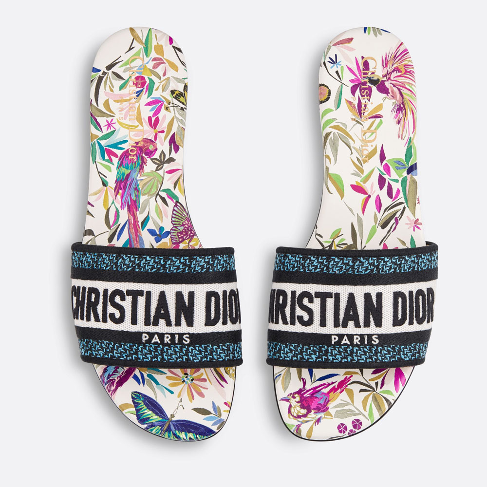 The Dway slide, a hallmark and timeless style, features a white multicolor Toile de Jouy Fantastica motif in a modern interpretation of the iconic pattern that showcases a colorful jungle full of parrots, monkeys and butterflies in pop colors. The upper has an embroidered Christian Dior Paris signature for an instantly recognizable touch. Its streamlined silhouette makes it easy to slip on to complete a relaxed look that will pair well with other Toile de Jouy Fantastica creations from the collection.