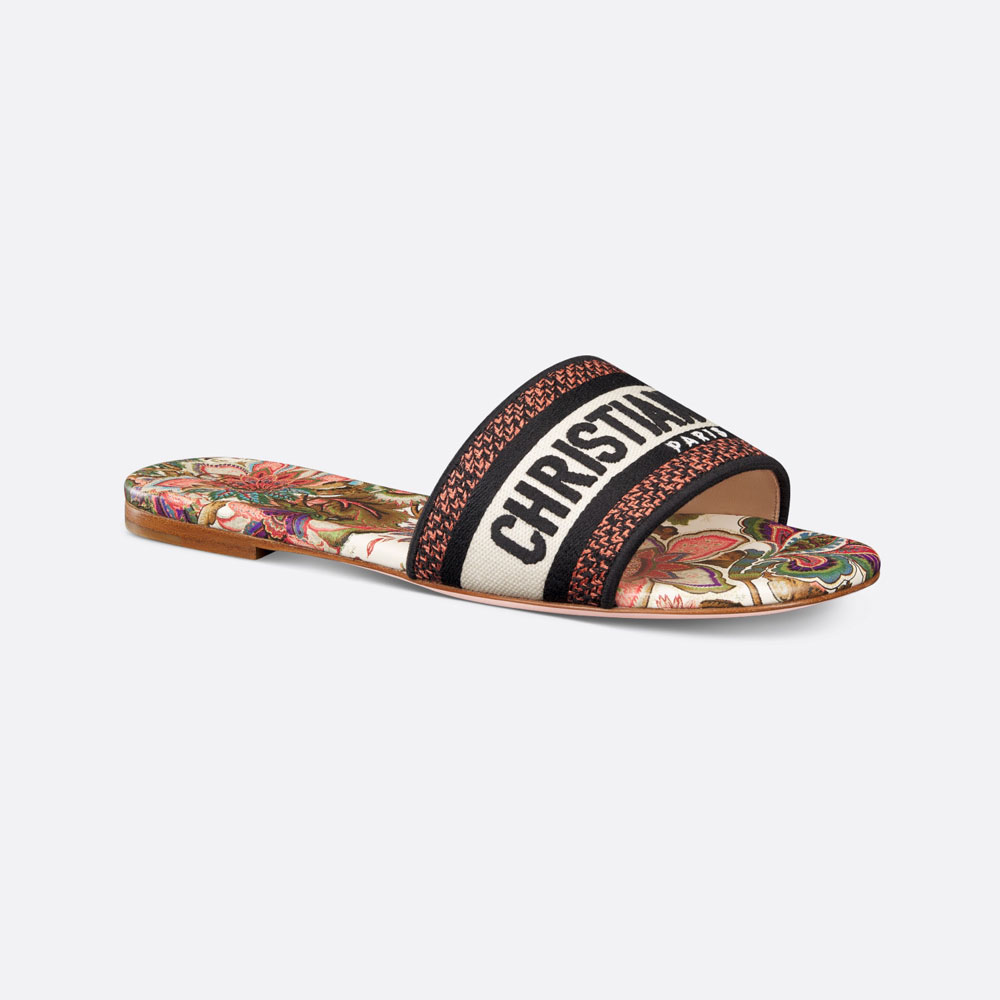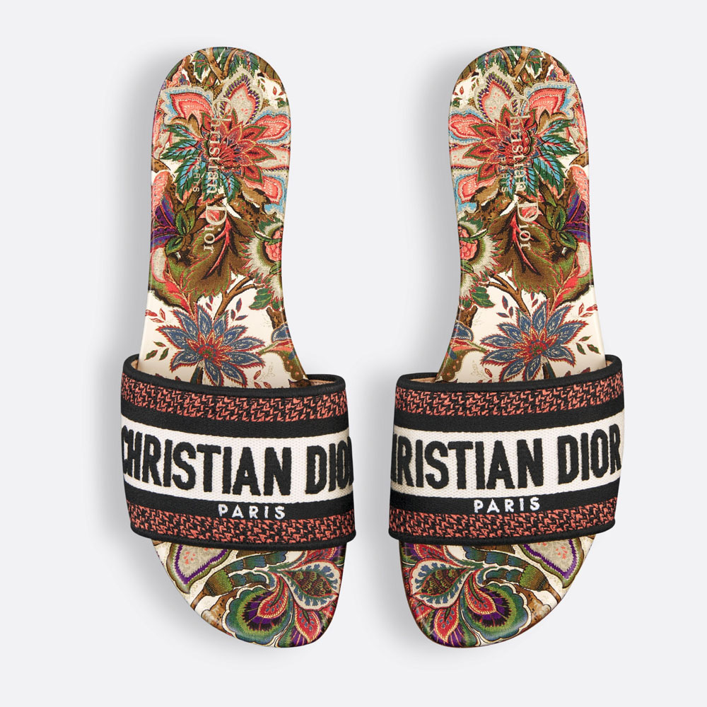The timeless, hallmark Dway slide features a white multicolor Albero della Vita motif, showcasing Mr. Dior's passion for nature through a poetic representation of the tree of life. The upper has an embroidered Christian Dior Paris signature for an instantly recognizable touch. Its streamlined silhouette makes it easy to slip on to complete a relaxed outfit. The slide can pair with other Albero della Vita creations from the collection.