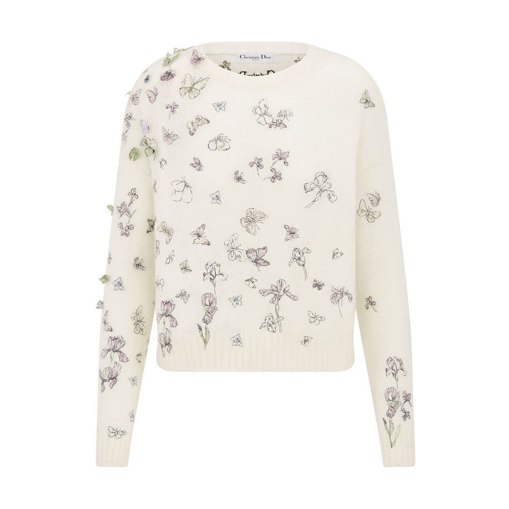 This elegant sweater combines alpaca, cashmere, and silk knit in white. It features a beautiful multicolor Butterflies & Iris motif with soft watercolor effects and 3D butterfly details.