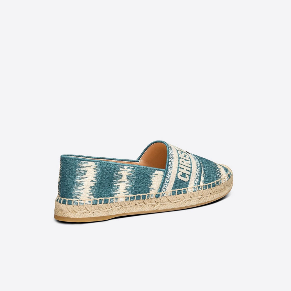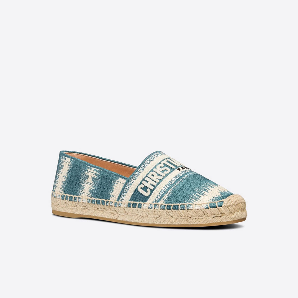 The Dior Granville espadrille features the D-Stripes motif, inspired by a heathered effect. Crafted in deep ocean blue and ecru embroidered cotton, it is embellished with hallmark House details like the CHRISTIAN DIOR signature on the upper. The shoe has a rope sole made in a traditional manner and may be coordinated with other D-Stripes creations of the collection.