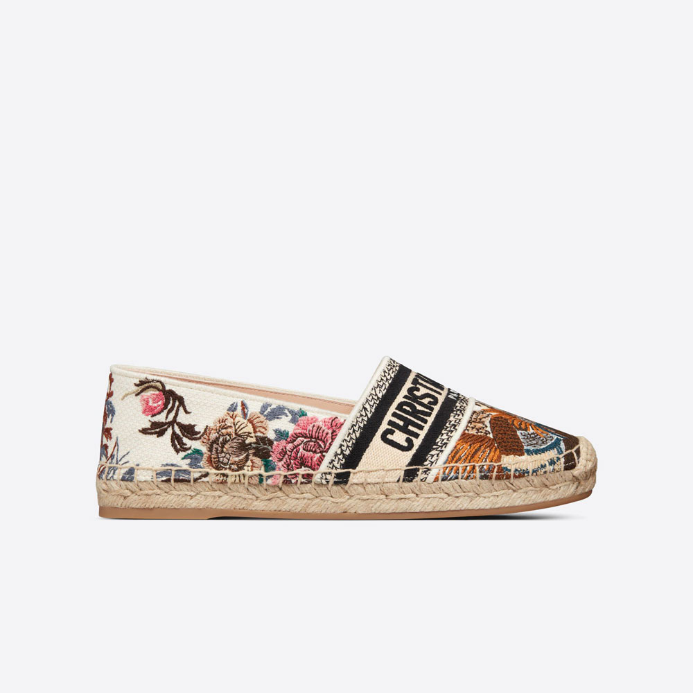 The Dior Granville espadrille presents the collection's key Dior Jardin d'Hiver motif. offering a poetic and exotic variation of Mr. Dior's wall tapestries. Crafted in white multicolor embroidered cotton. it is embellished with iconic House details like the 'CHRISTIAN DIOR PARIS' signature on the upper. The shoe has a rope sole made in a traditional manner and may be coordinated with other Dior Jardin d'Hiver creations from the collection.