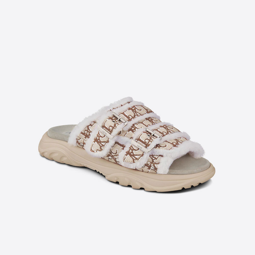 The Dior H-Town sandal is part of the exclusive collaboration with CACTUS JACK. Crafted in jacquard. it features the cream Cactus Jack Oblique motif. a new take on an iconic House element. A white shearling interior. hybrid rubber sole. 'DIOR' buckle straps and stud detailing complete the design. The sandal can be worn with Bermuda shorts or jeans.