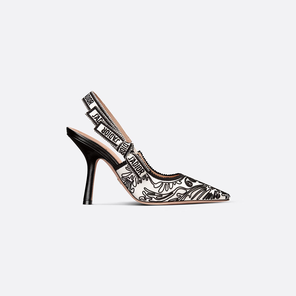 The Jadior slingback pump embodies the Houses exceptional savoir-faire. The black and white Cornely-embroidered cotton style boasts the seasons signature Ornamental motif with Andalusian baroque inspiration in a graphic spirit