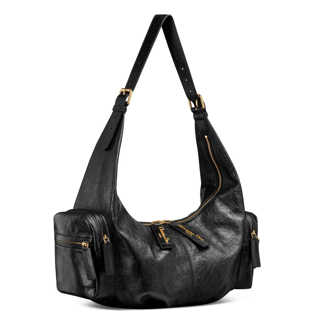 The Dior Large Grand Tour Multipocket Hobo bag in black crinkled calfskin is a versatile accessory that pairs beautifully with various outfits. For a chic daytime look, style it with a tailored blazer, slim-fit jeans, and ankle boots.
