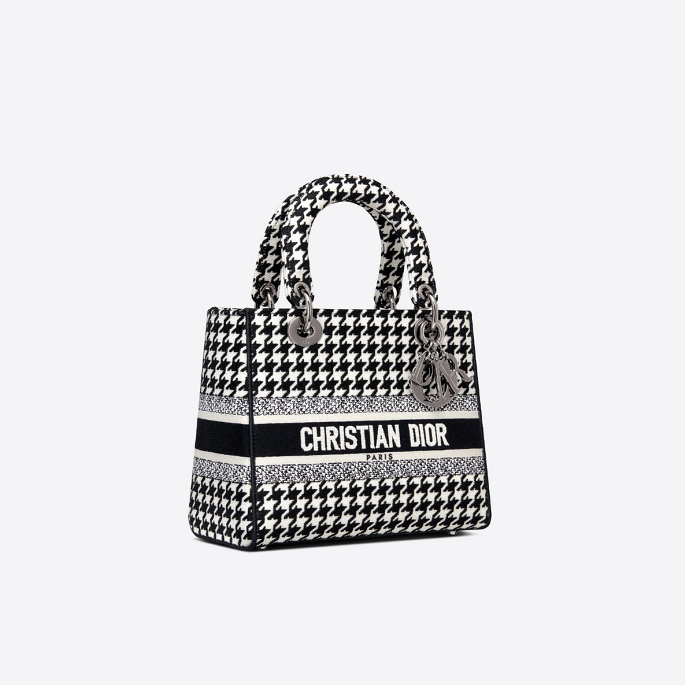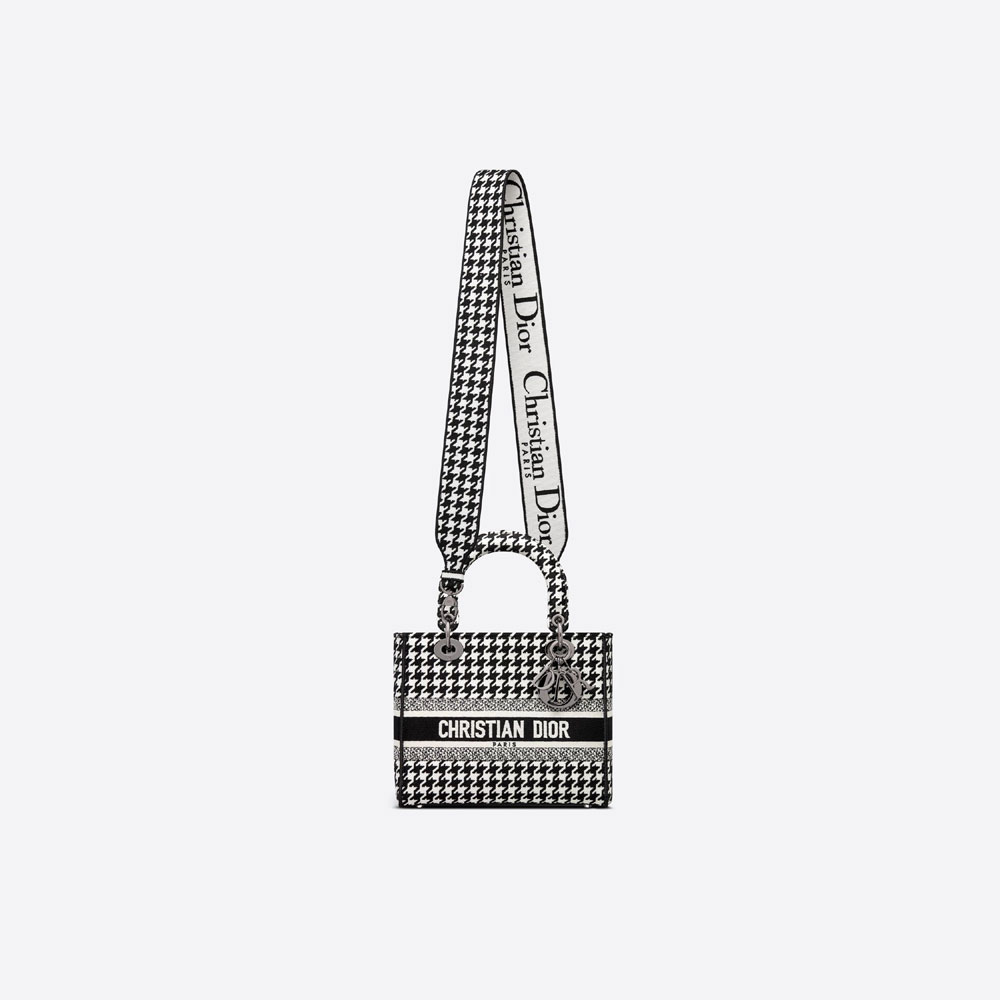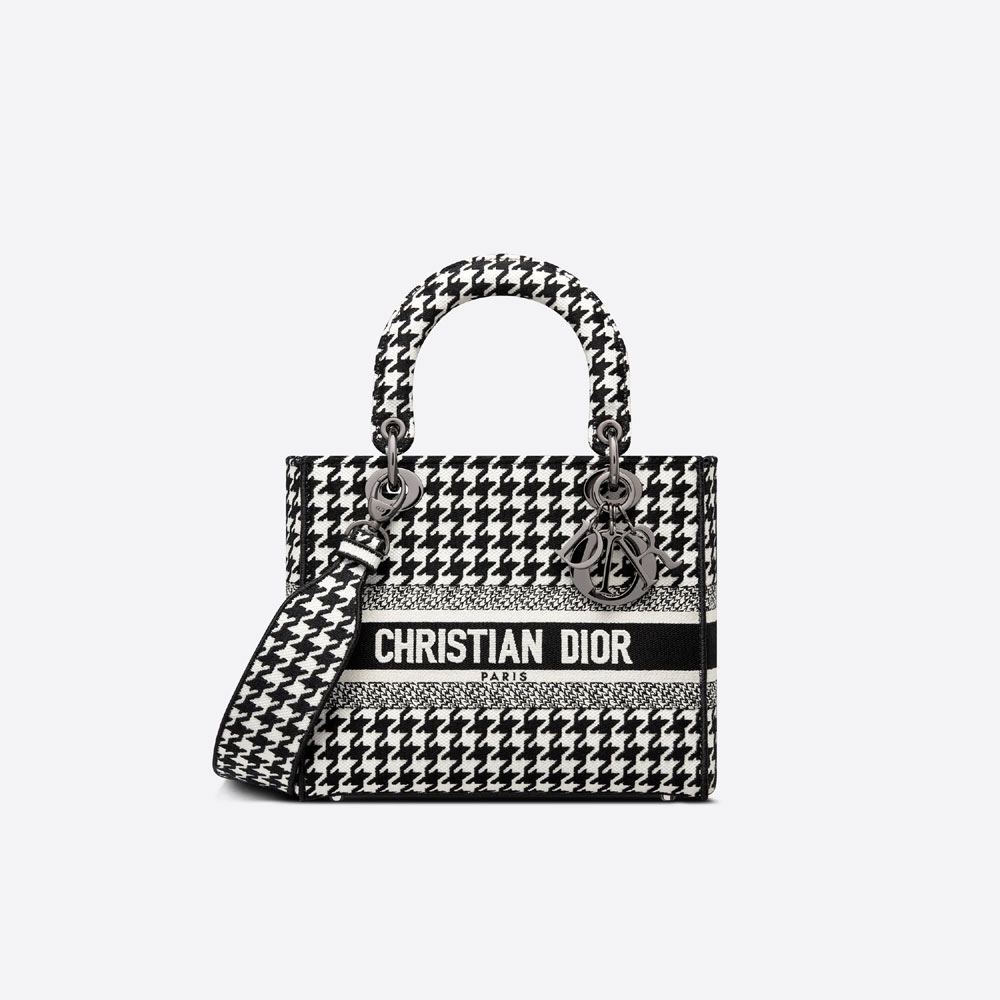 The Lady D-Lite bag combines classic elegance with House modernity. The style is fully embroidered with the black and white Houndstooth motif. and is accented with the 'CHRISTIAN DIOR PARIS' signature on the front. Ruthenium-finish metal 'D.I.O.R.' charms embellish and illuminate the silhouette. Equipped with a wide. reversible and removable embroidered shoulder strap. the medium Lady D-Lite bag can be carried by hand or worn crossbody.