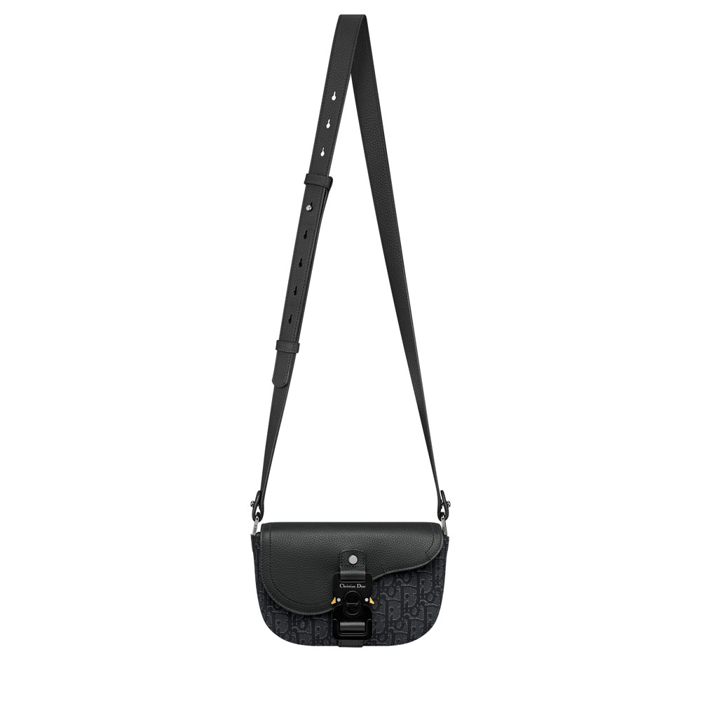 This compact messenger bag reinvents Dior's classic Saddle design with contemporary elegance. The black jacquard body features subtle silver metallic Dior Oblique pattern, topped with grained calfskin flap.