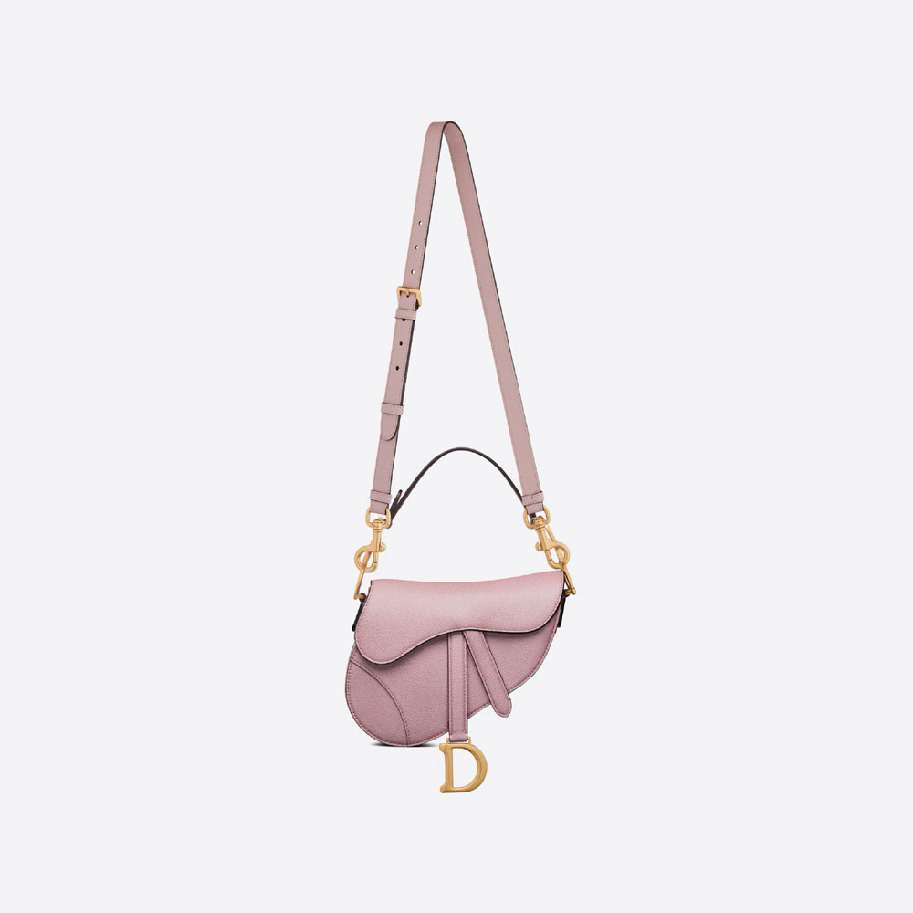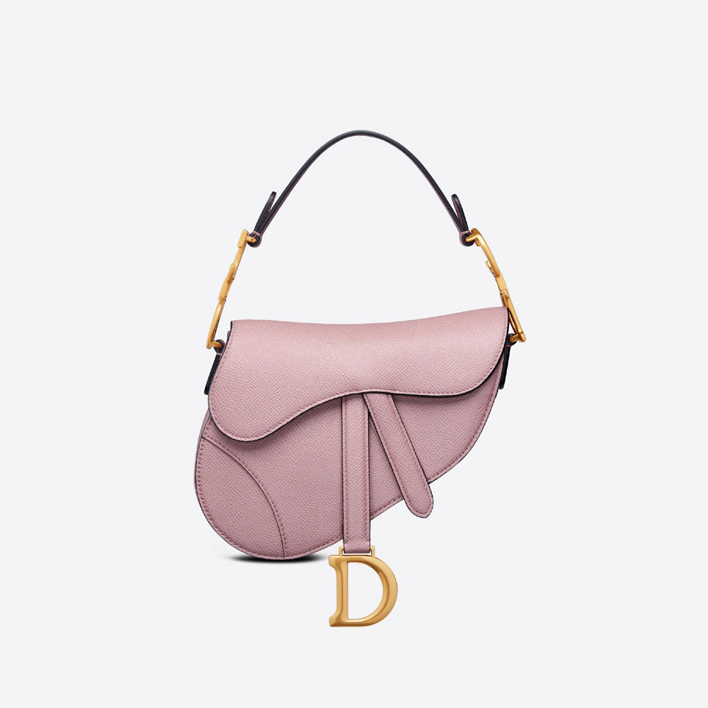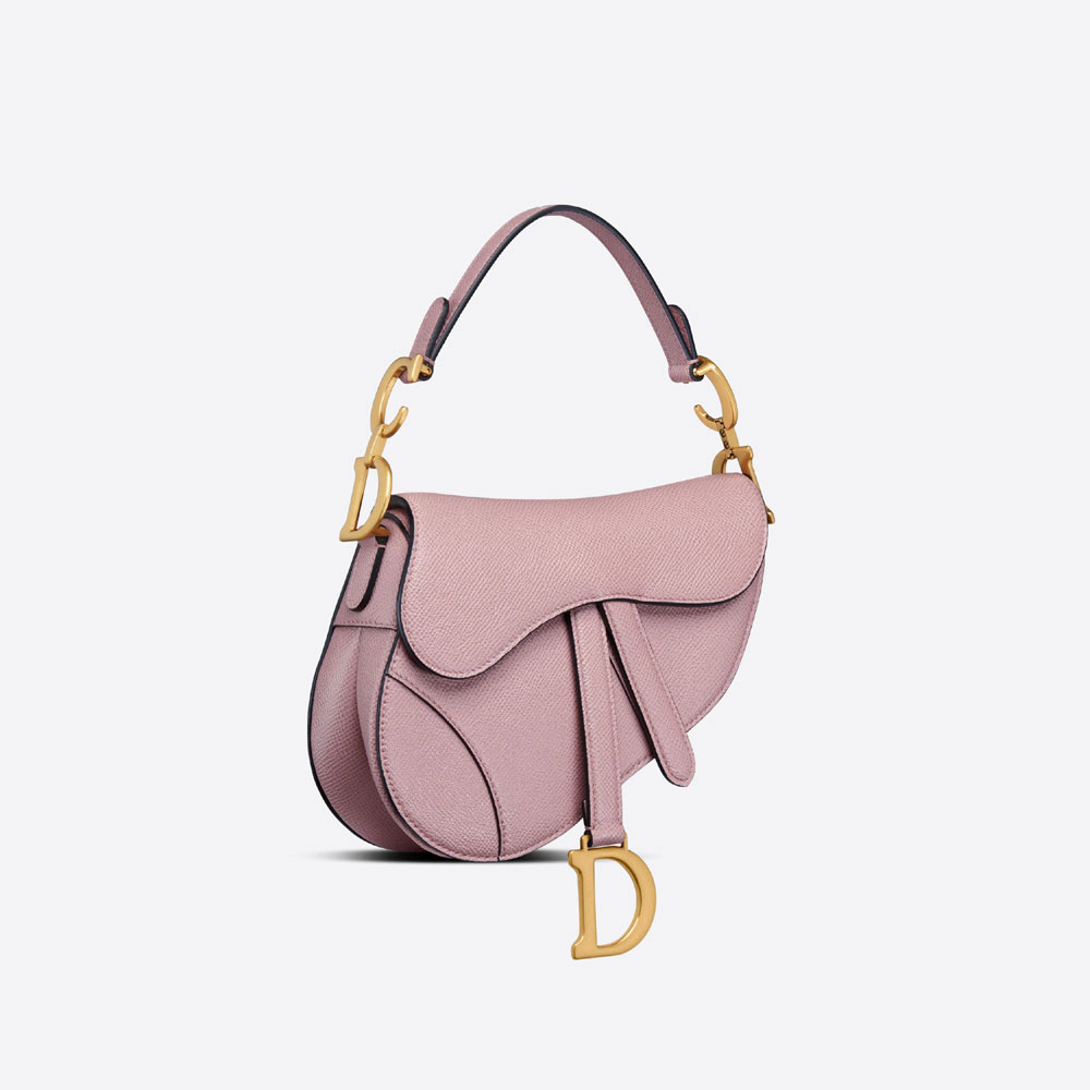 Maria Grazia Chiuri brings a fresh update to the iconic Saddle bag. Crafted in antique pink grained calfskin. the legendary design features a Saddle flap with a magnetic 'D' stirrup clasp. as well as an antique gold-finish metal 'CD' signature on either side of the strap. Featuring a thin. adjustable and removable shoulder strap. the miniature Saddle bag may be carried by hand. worn over the shoulder or crossbody.