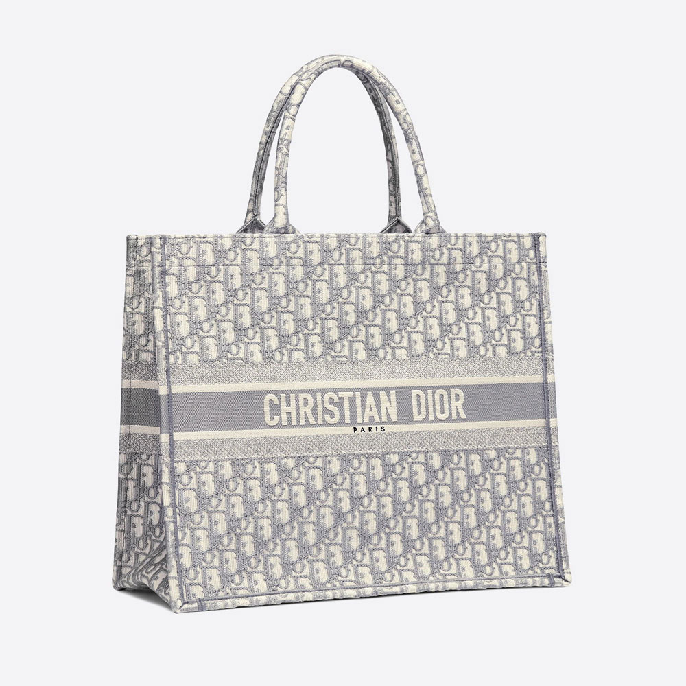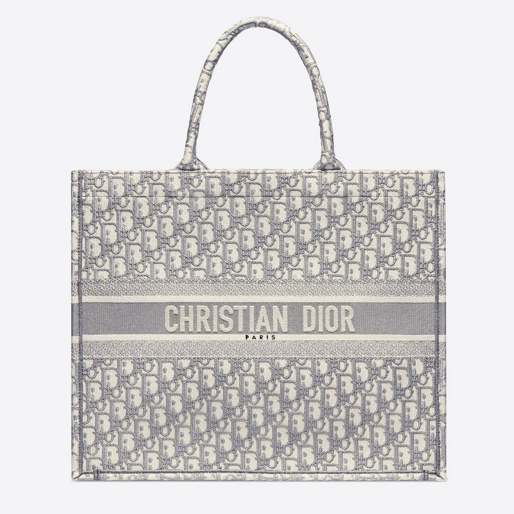 The Dior Book Tote, an original style introduced by Creative Director Maria Grazia Chiuri, has become a staple of the Dior aesthetic. Ideally designed to carry all your daily essentials, the large shape is fully embroidered with a gray Dior Oblique pattern and the Christian Dior signature on the front. This carryall is a perfect example of the Dior savoir-faire and it may be worn with other small accessories or the Mitzah scarf for a complete look.Christian Dior signature