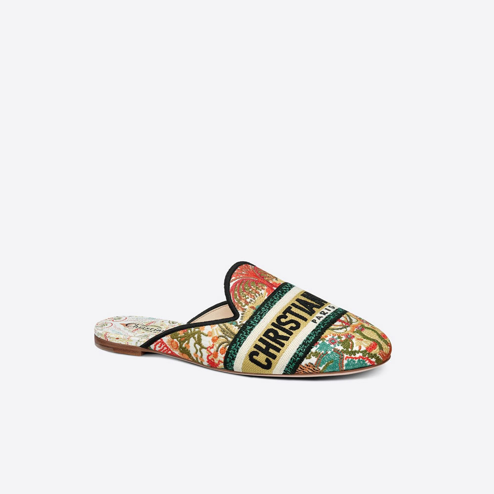 The Dior Off mule features the Dior in Heart Lights motif intertwined with a heart, a symbol cherished by the House and inspired by southern Italys festivals of lights. The multicolor embroidered cotton upper is embellished with a Christian Dior signature. The shoe can be paired with other creations in the Dior in Heart Lights collection.