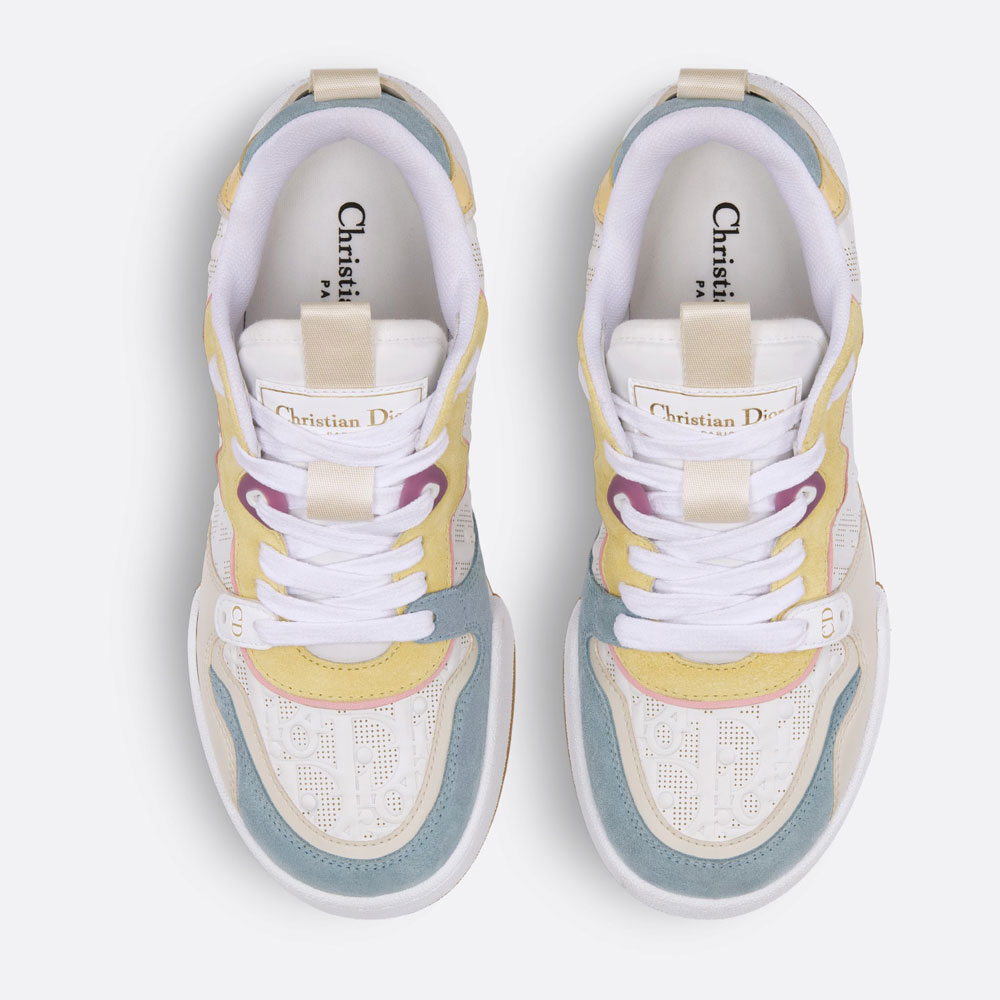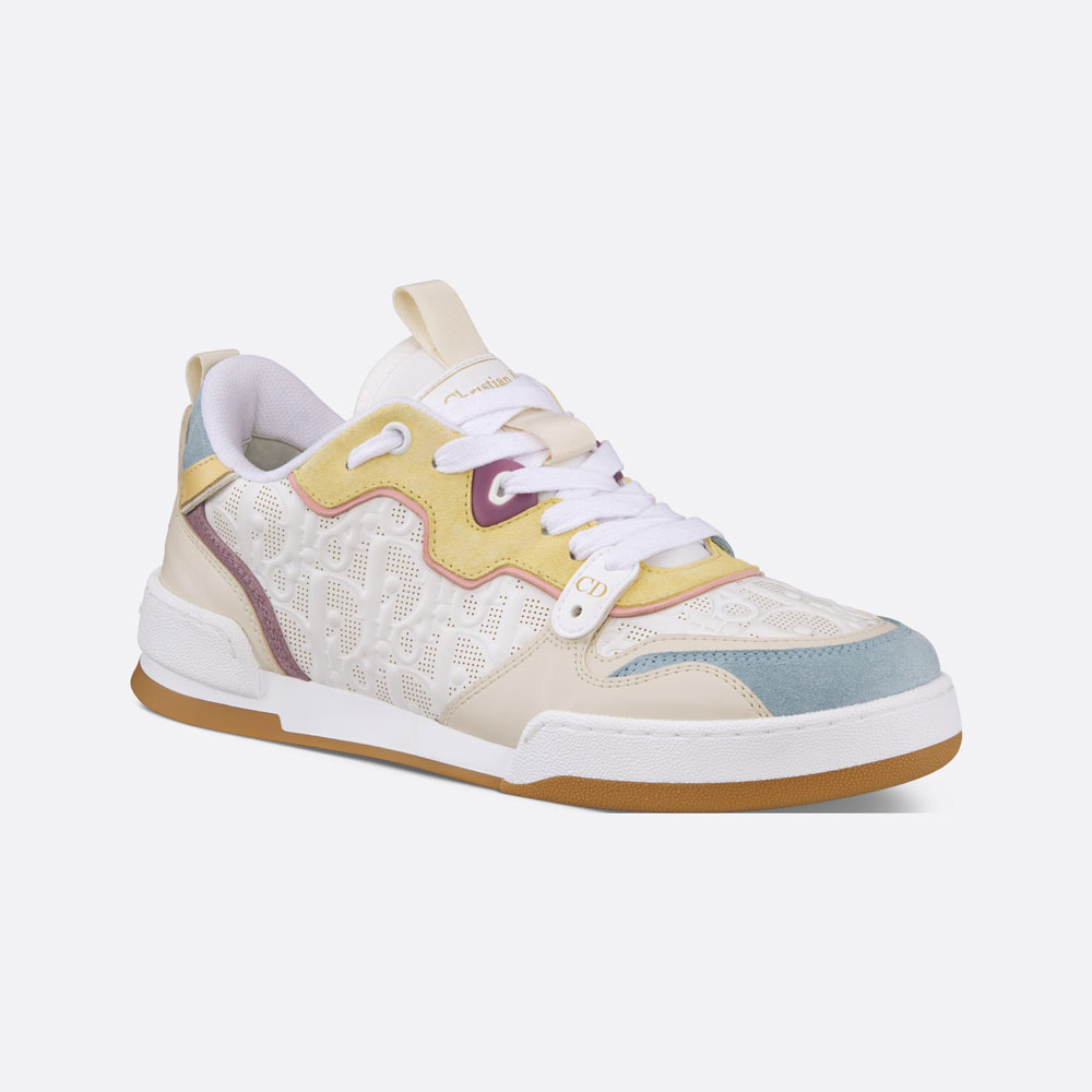 The Dior One sneaker showcases the House's savoir-faire with a modern creation. The perforated white calfskin showcases the Dior Oblique motif contrasted by suede calfskin inserts in pastel shades. A star embellishes the heel, while the tongue features the Christian Dior Paris signature and a gold-tone CD signature highlights the lacing. The sneaker will complete all of the season's casual outfits.