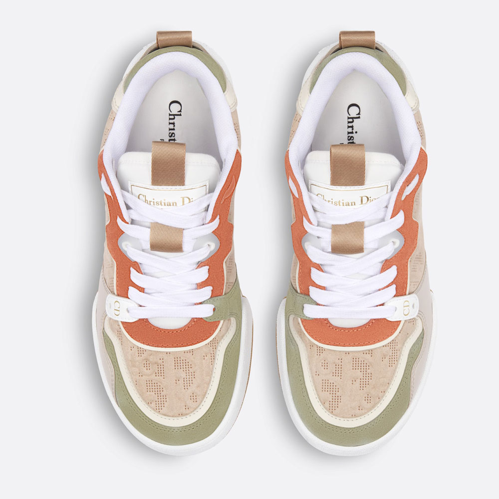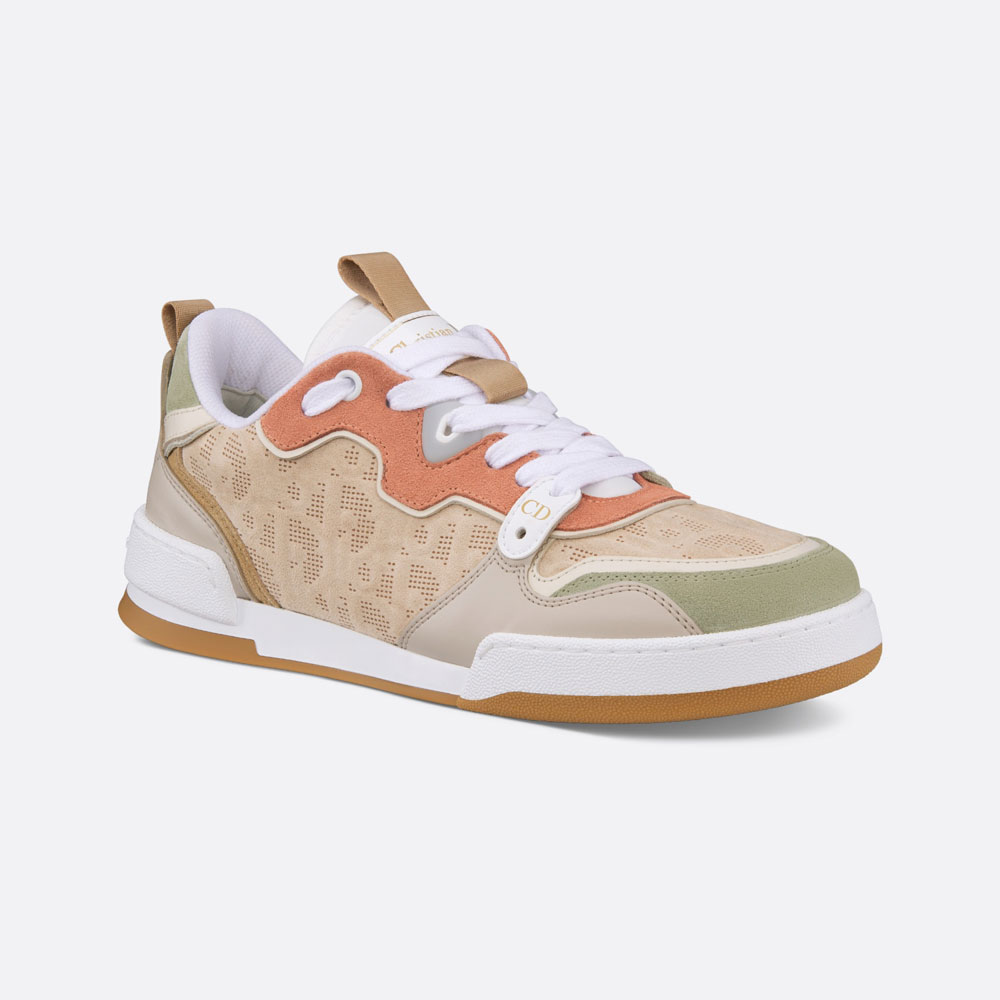The Dior One sneaker showcases the House's savoir-faire with a modern creation. The perforated beige suede calfskin showcases the Dior Oblique motif contrasted by suede calfskin and plain calfskin inserts in pastel shades. A star embellishes the heel, while the tongue features the Christian Dior Paris signature and a gold-tone CD signature highlights the lacing. The sneaker will complete all of the season's casual outfits.